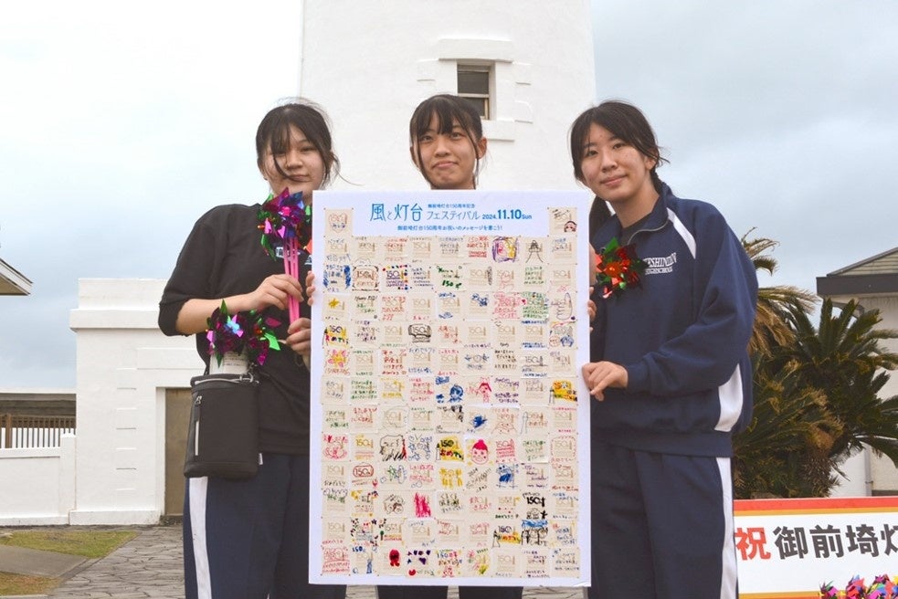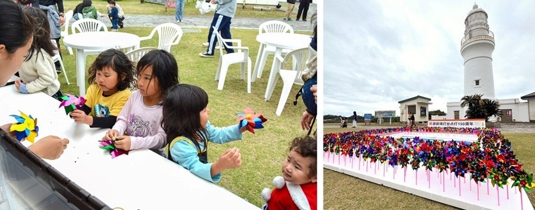 ヒカリテラス御前崎は、2024年11月10日(日)に御前埼灯台(静岡県御前崎市)周辺にて、御前埼灯台150周年記念イベント「風と灯台フェスティバル」を開催しました。150年間風雨に耐え続け、今なお毎日海の安全を見守っている御前埼灯台の労と功績をねぎらい、来場者と作る1000個の風車(かざぐるま)で灯台周辺を装飾し、150周年を祝いました。このイベントは、日本財団「海と日本プロジェクト」の一環として、灯台を中心に地域の海の記憶を掘り起こし、地域と地域、異分野と異業種、⽇本と世界をつなぎ、新たな海洋体験を創造していく「海と灯台プロジェクト」の助成を受けて実施しました。