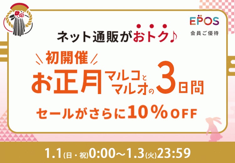 - タイトル:ネット通販限定 エポスカード会員ご優待 10%OFF『お正月 マルコとマルオの3日間』