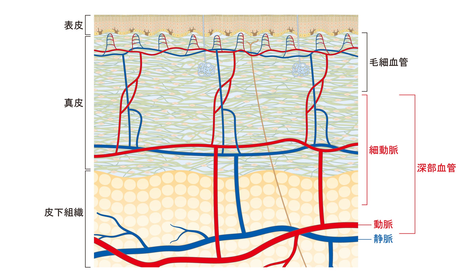 資生堂の血管研究では、加齢によって毛細血管が細く衰え、肌の弾力低下につながることや、毛細血管の状態が、シミの形成だけでなく改善プロセスにおいても密接に関係していることを解明してきました。しかし、毛細血管よりも太く、深部に存在する血管の加齢変化による影響については分かっていませんでした。