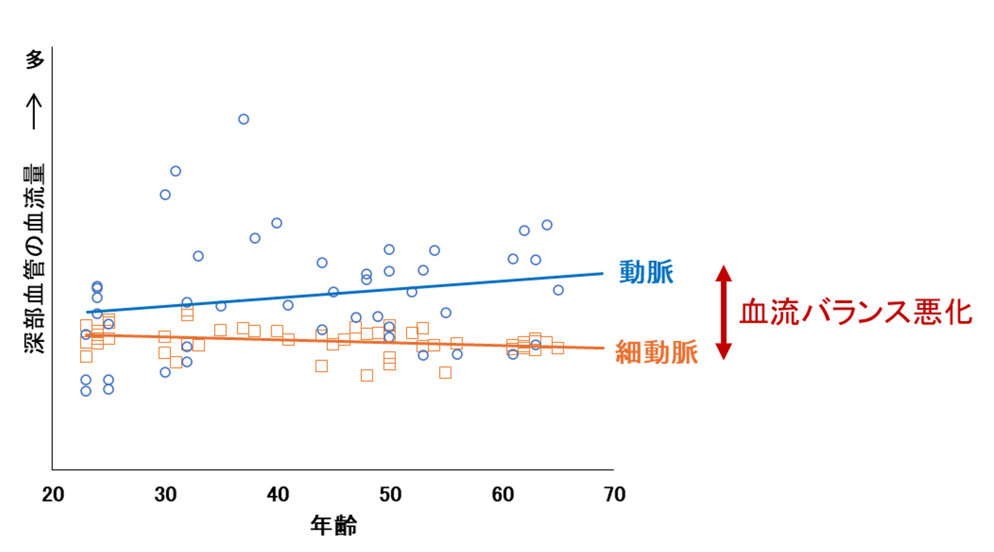 血流バランスを改善するために、深部血管の血流をコントロールする交感神経に着目しました。交感神経は、細動脈をはじめとした血管の動きを調整し、血流バランスを保つ神経です。その働きが高まると血管は収縮して血流が減少し、働きが弱まると血管は広がって血流が増加します。この調整機能は、加齢によって酸化ストレスが蓄積すると、低下することが知られています。