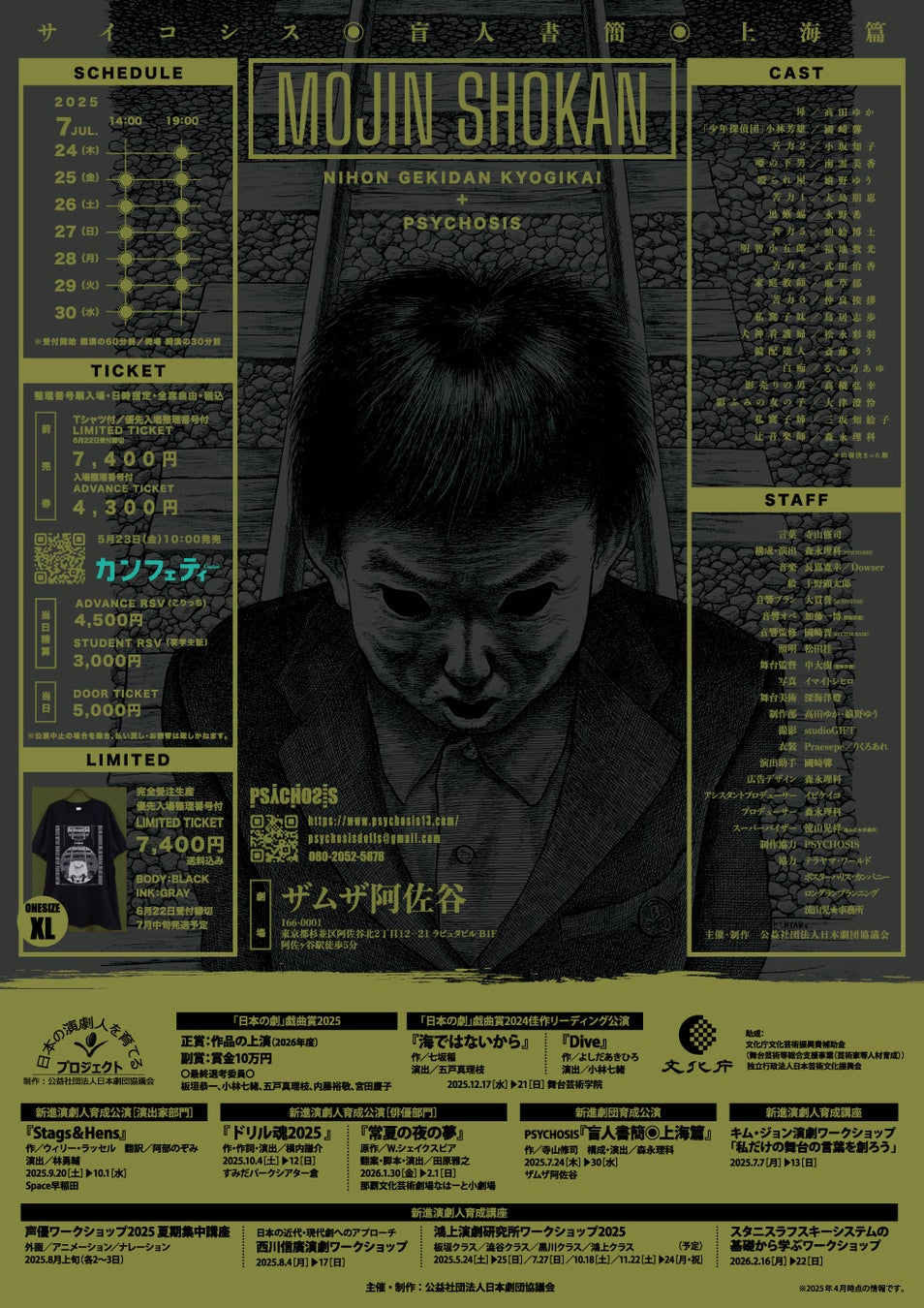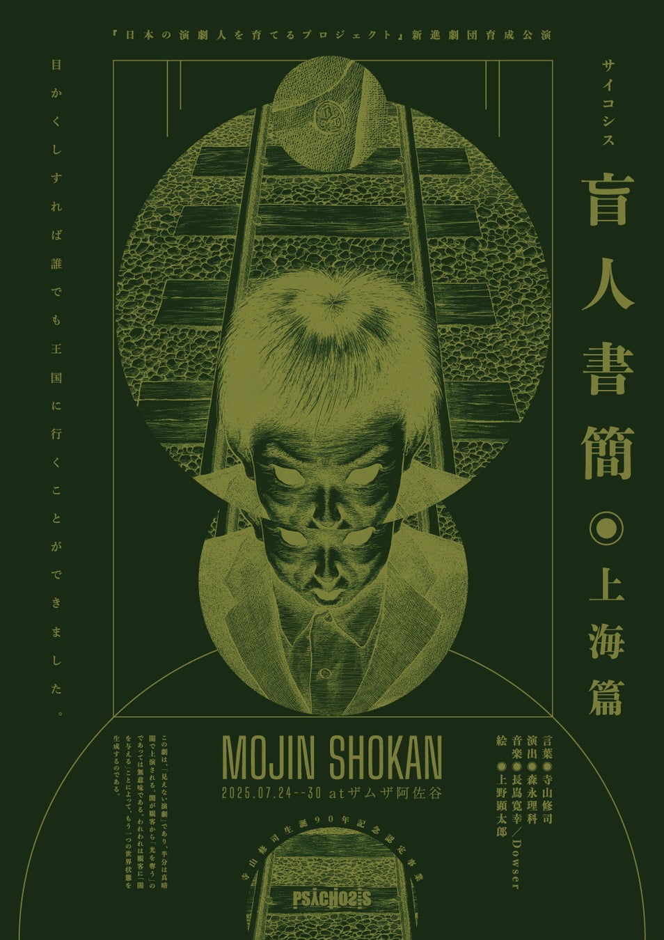 「日本の演劇人を育てるプロジェクト」新進劇団育成公演 寺山修司生誕90年記念認定事業 PSYCHOSIS『盲人書簡◉上海篇』が2025年7月24日 (木) ~ 2025年7月30日 (水)にザムザ阿佐谷(東京都杉並区阿佐ヶ谷北2-12-21)にて上演されます。