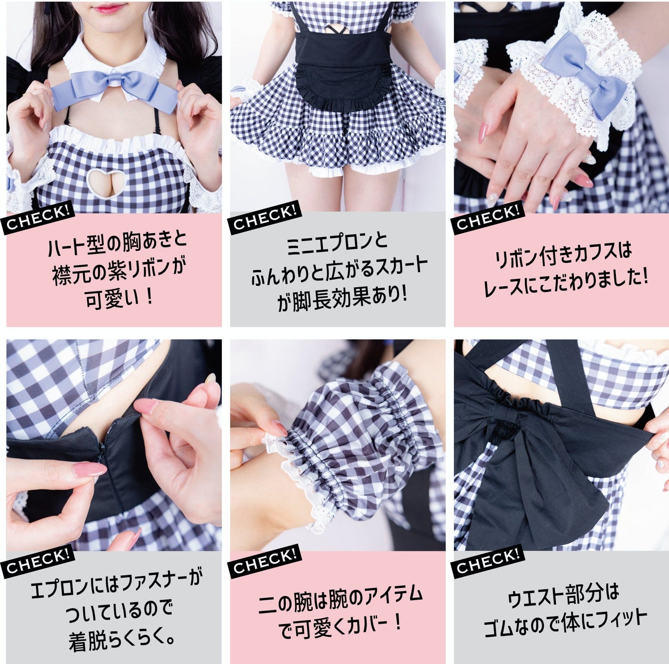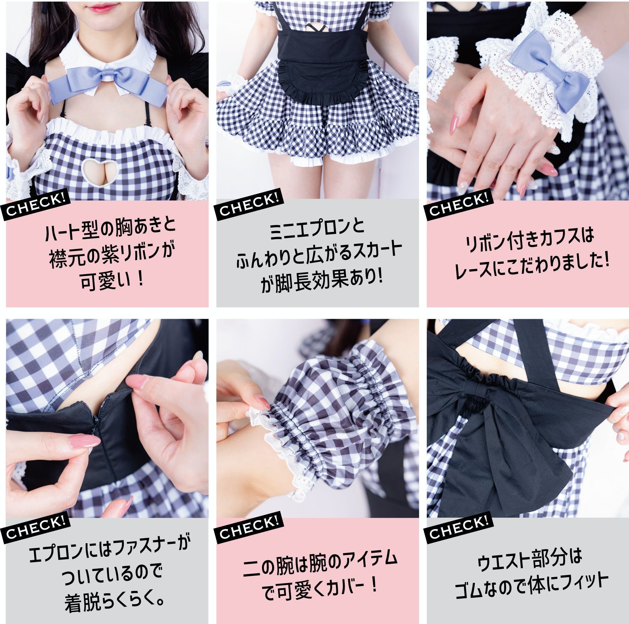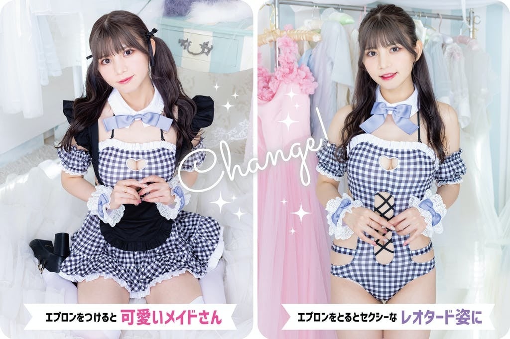 スカート付きエプロンをつけると、とても可愛らしいメイドさんに。外すとセクシーなレオタード姿に♪