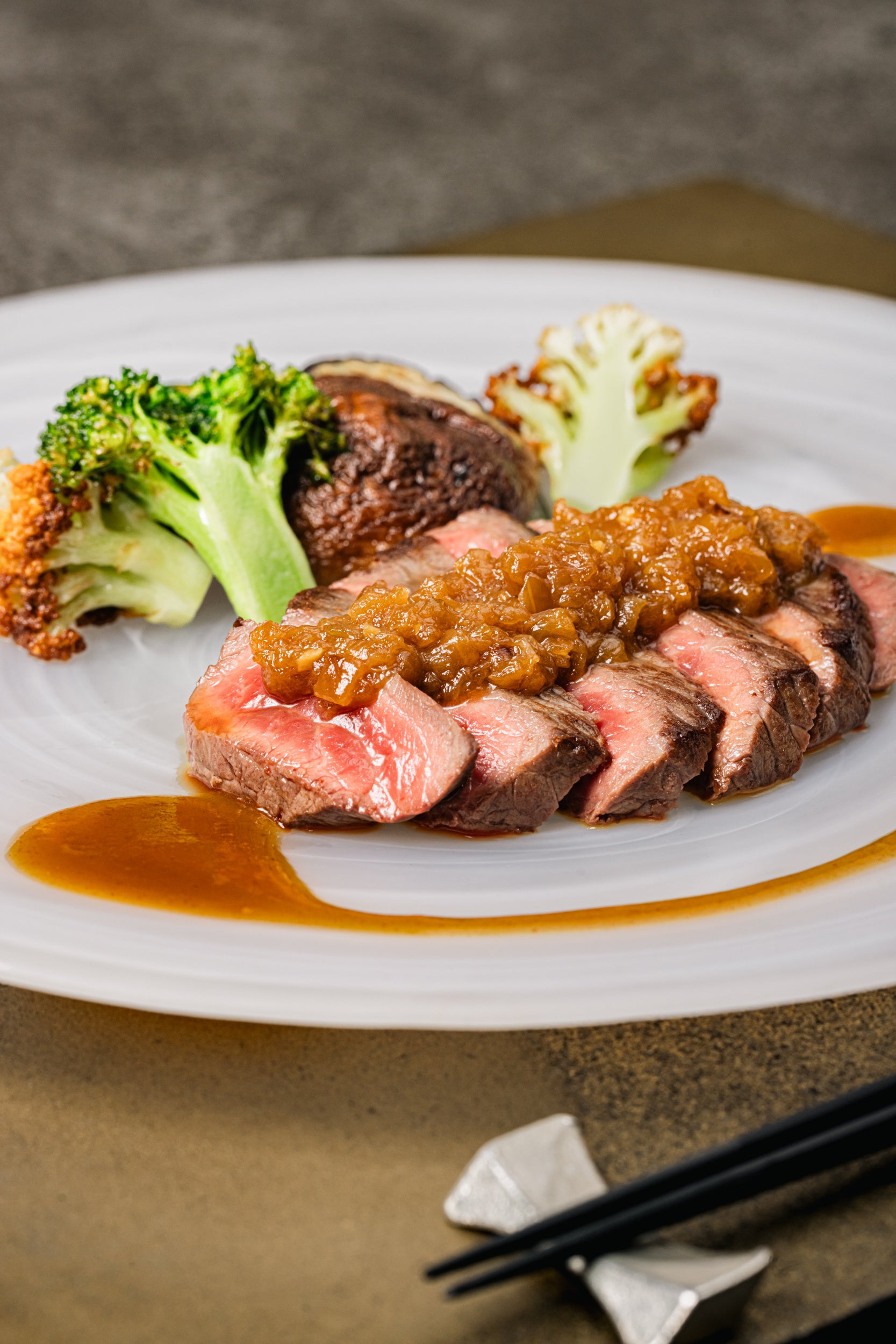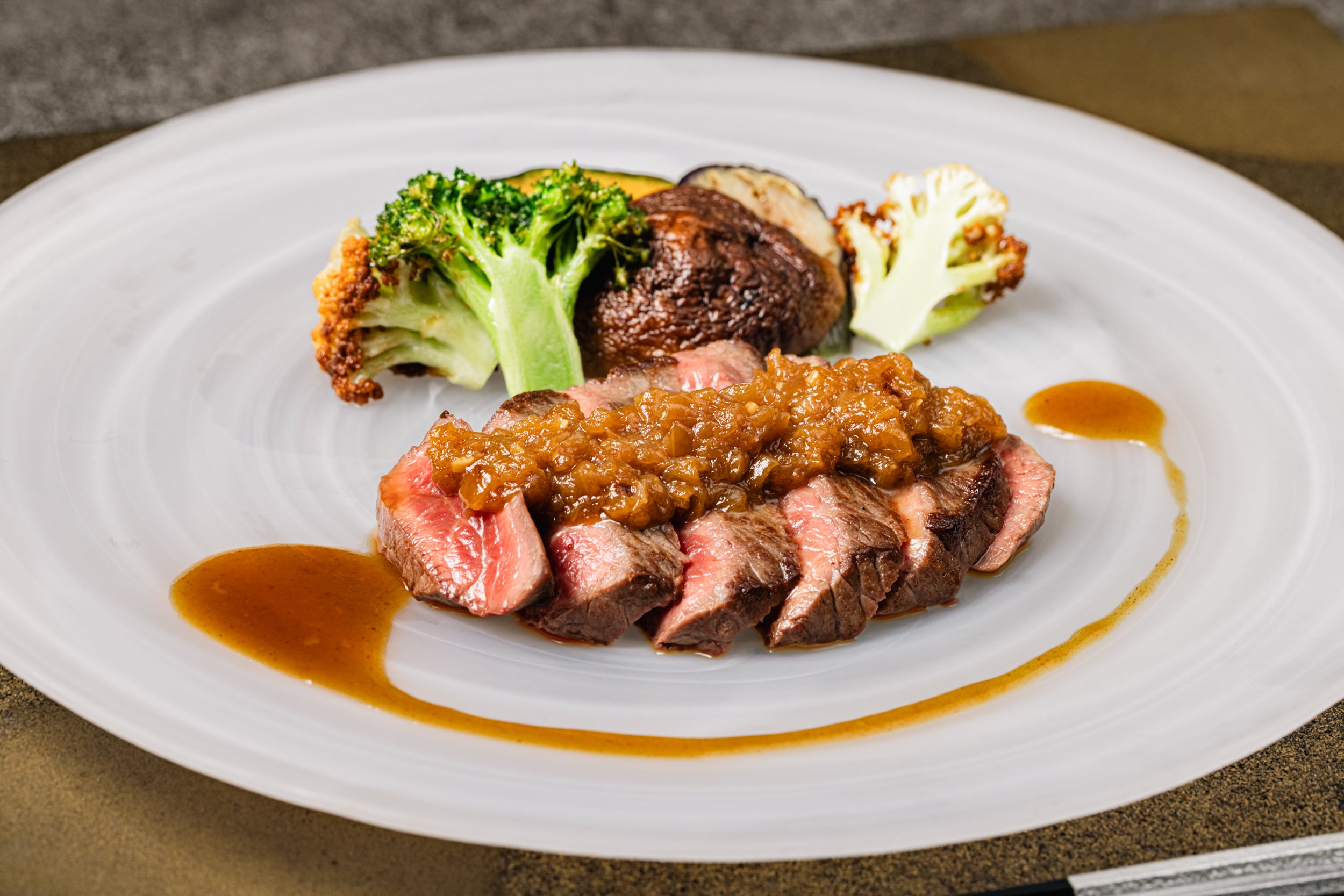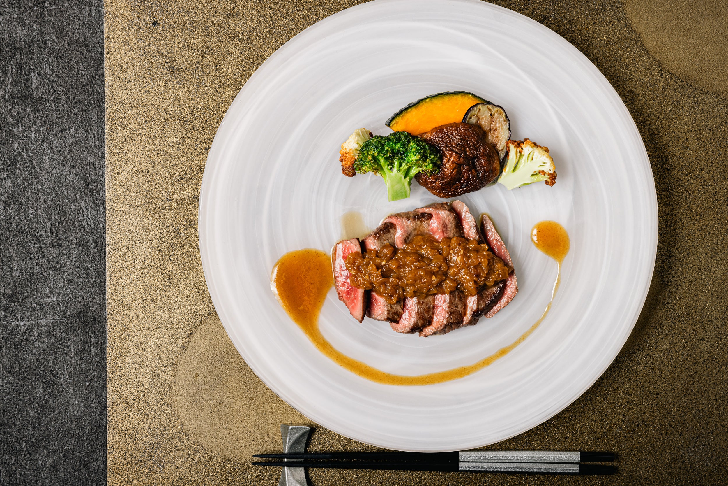 お好みの焼き加減でご提供する黒毛和牛モモ肉のステーキや、にんにくと焦がし醤油の風味豊かなガーリックライスなど5品を鉄板焼で調理します。