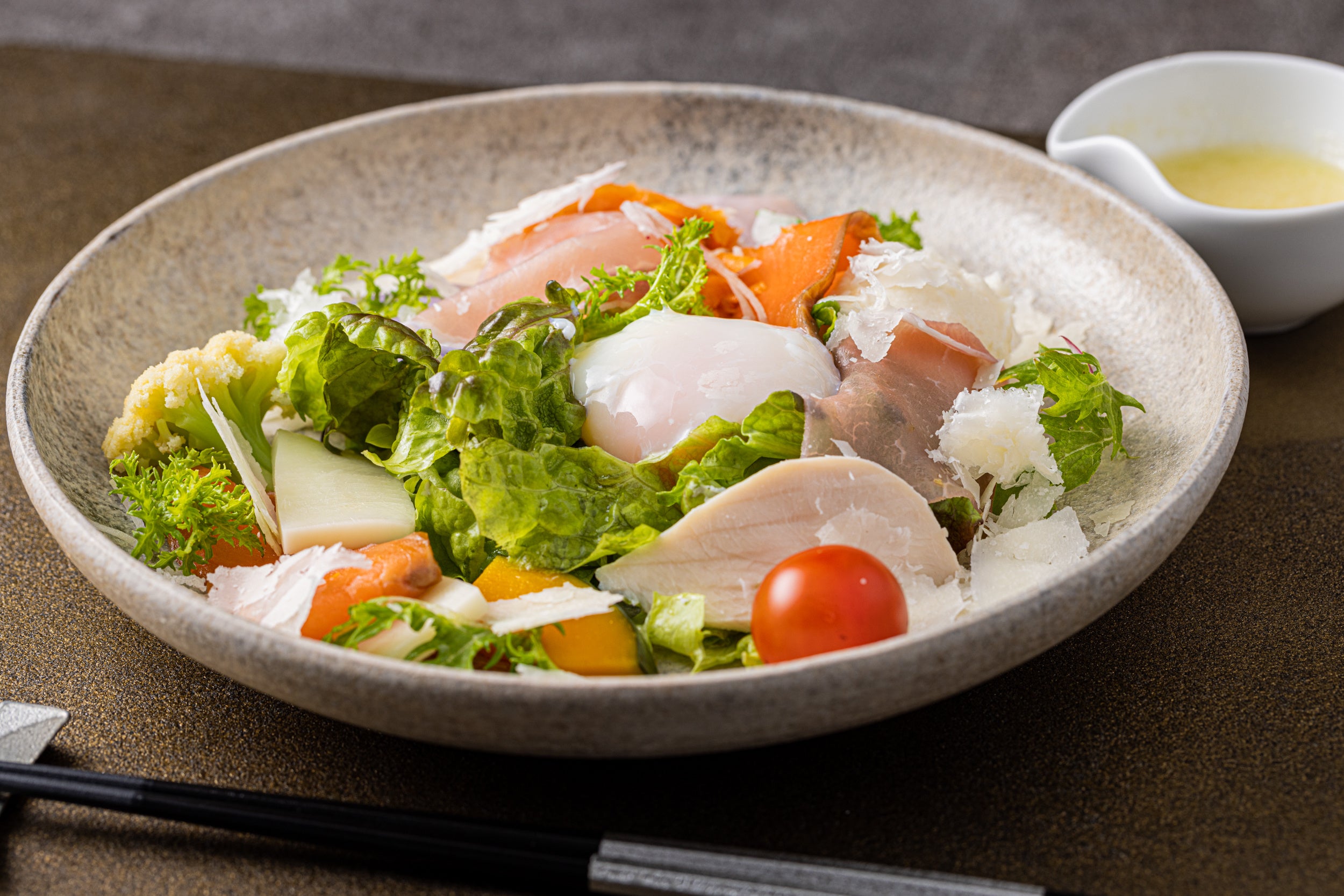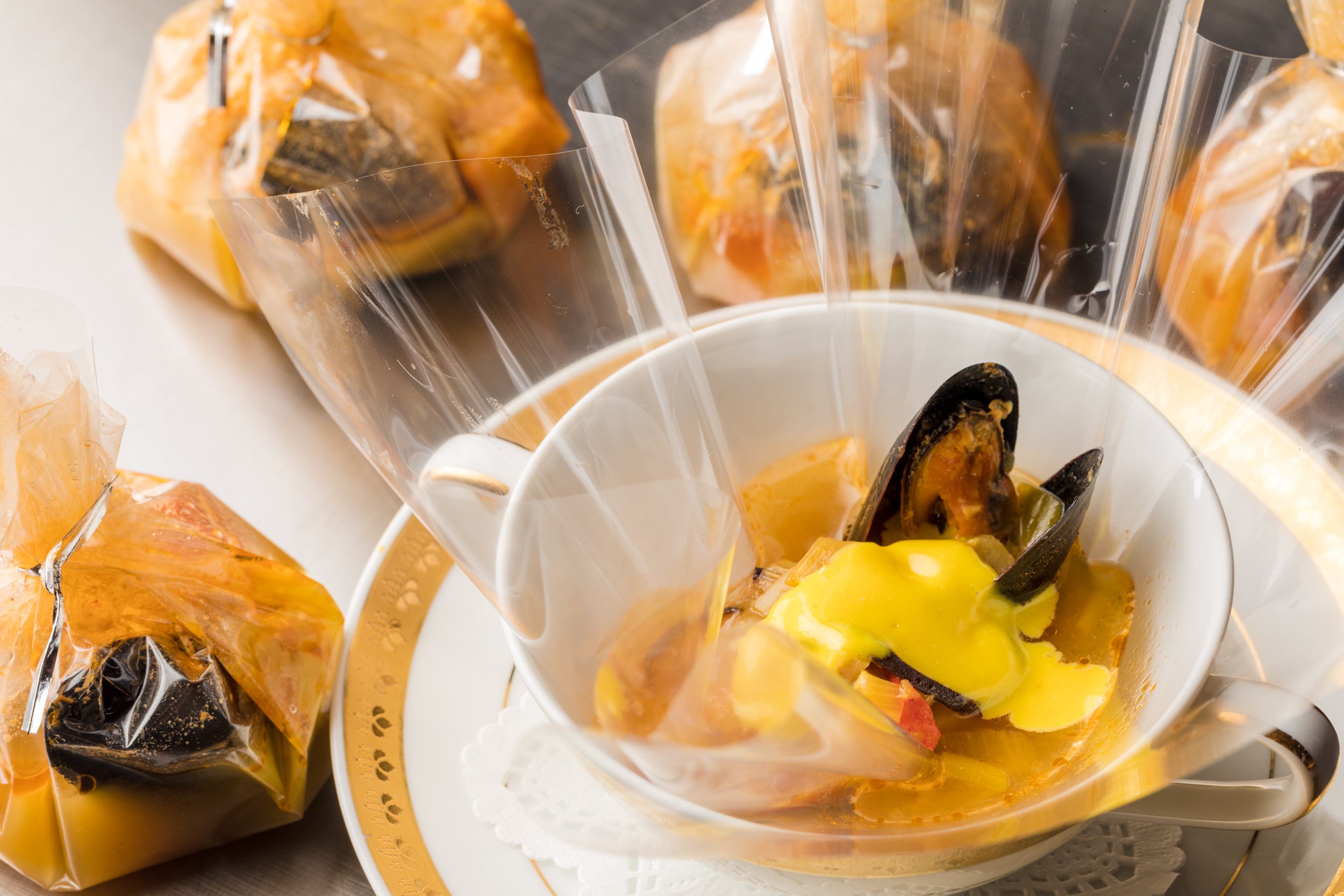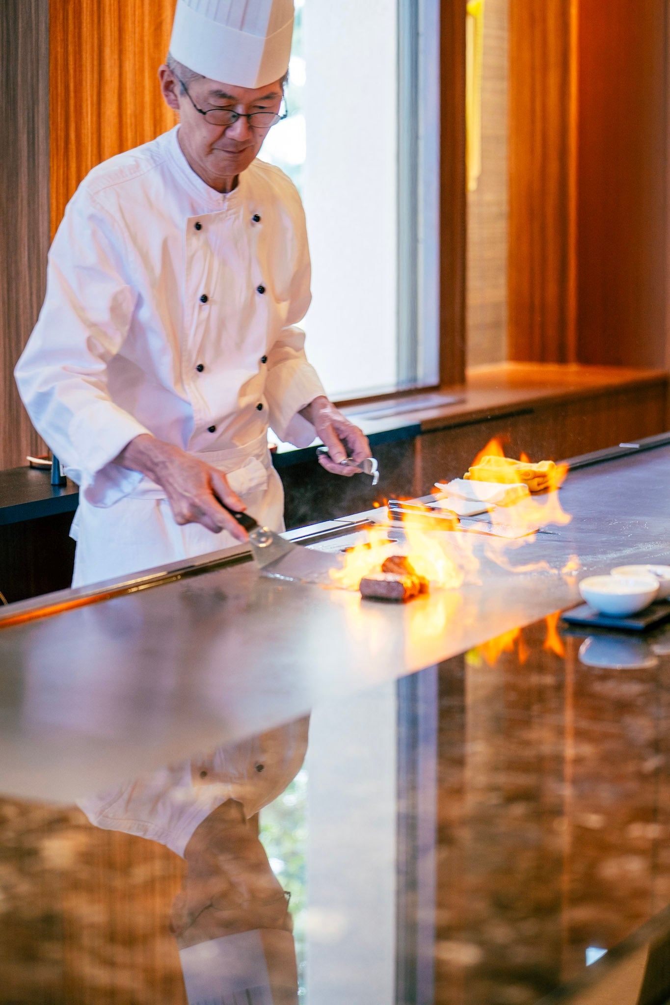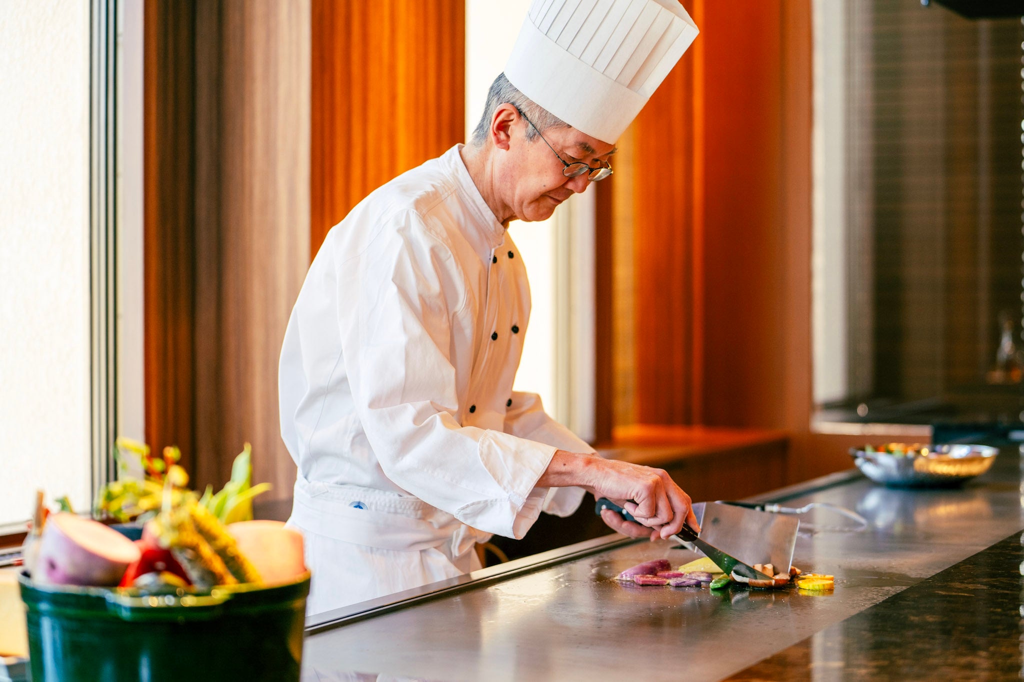 メニューは地野菜を中心としたサラダ前菜から始まります。サラダをお召し上がりの間に、ホテルの名物のブイヤベースを特殊なフィルムで包んで、鉄板焼でじっくりと温めます。フィルムの中でブイヤベースが沸々と温まる様子は、目の前で調理が行われる鉄板焼きならではの楽しみ方のひとつです。