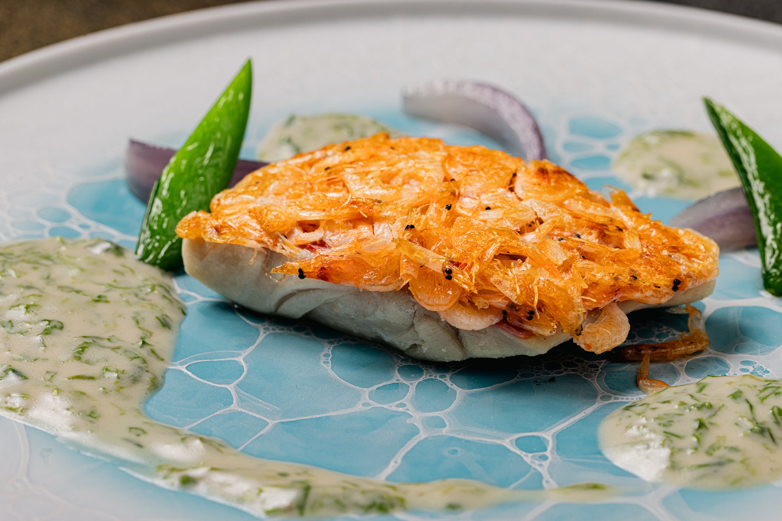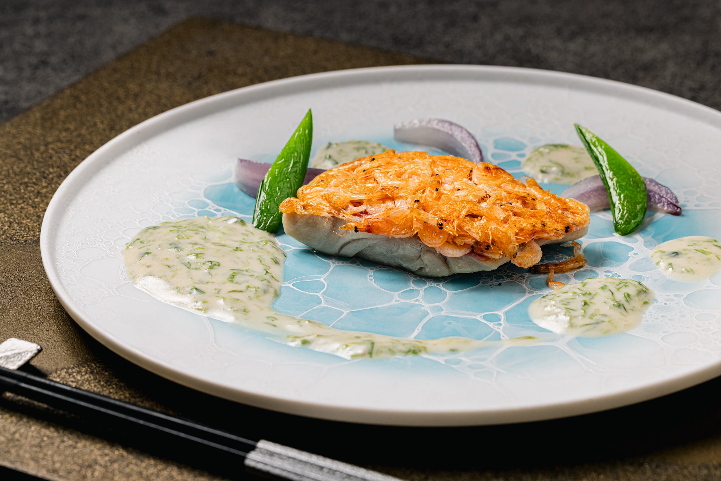 おすすめは金目鯛。桜海老を金目鯛の皮目に張り付け、一緒に香ばしく焼き上げることでパリッとした食感と風味が味わえます。海の香りを思わせる青海苔入りヴァンブランソースを合わせてお召し上がりいただくことで、口の中に“海の幸”が広がります。