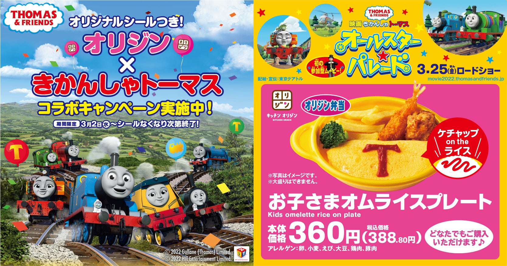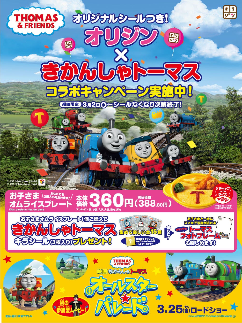 また、「お子さまオムライスプレート」購入で、もれなく人気キャラクター「きかんしゃトーマス」のオリジナルシールがもらえる「オリジン×きかんしゃトーマス」コラボキャンペーンを実施いたします。