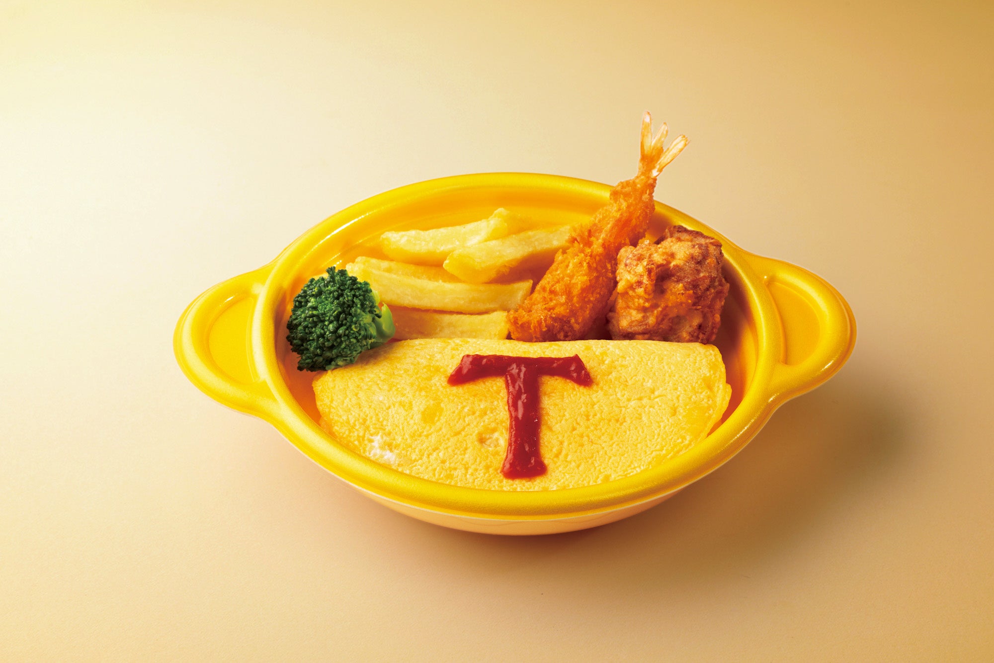 ケチャップをかけた白いライスを玉子でやさしく包んだオムライスに、エビフライと若鶏の唐揚げとフライドポテト、緑の彩りブロッコリーも添えました。オムライスには、トーマスの「T」の字が描かれています。
