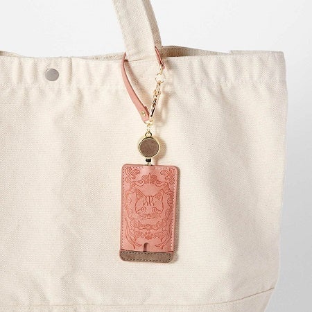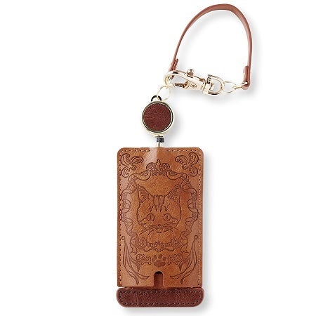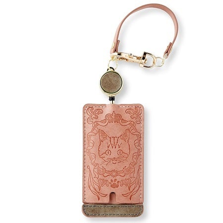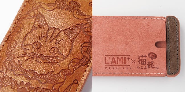 肉球や猫のおもちゃとともに、かわいい猫さんを型押して、大人っぽく上品なデザインにしています。裏面には「ラミプリュス×猫部」の型押しロゴ入り。