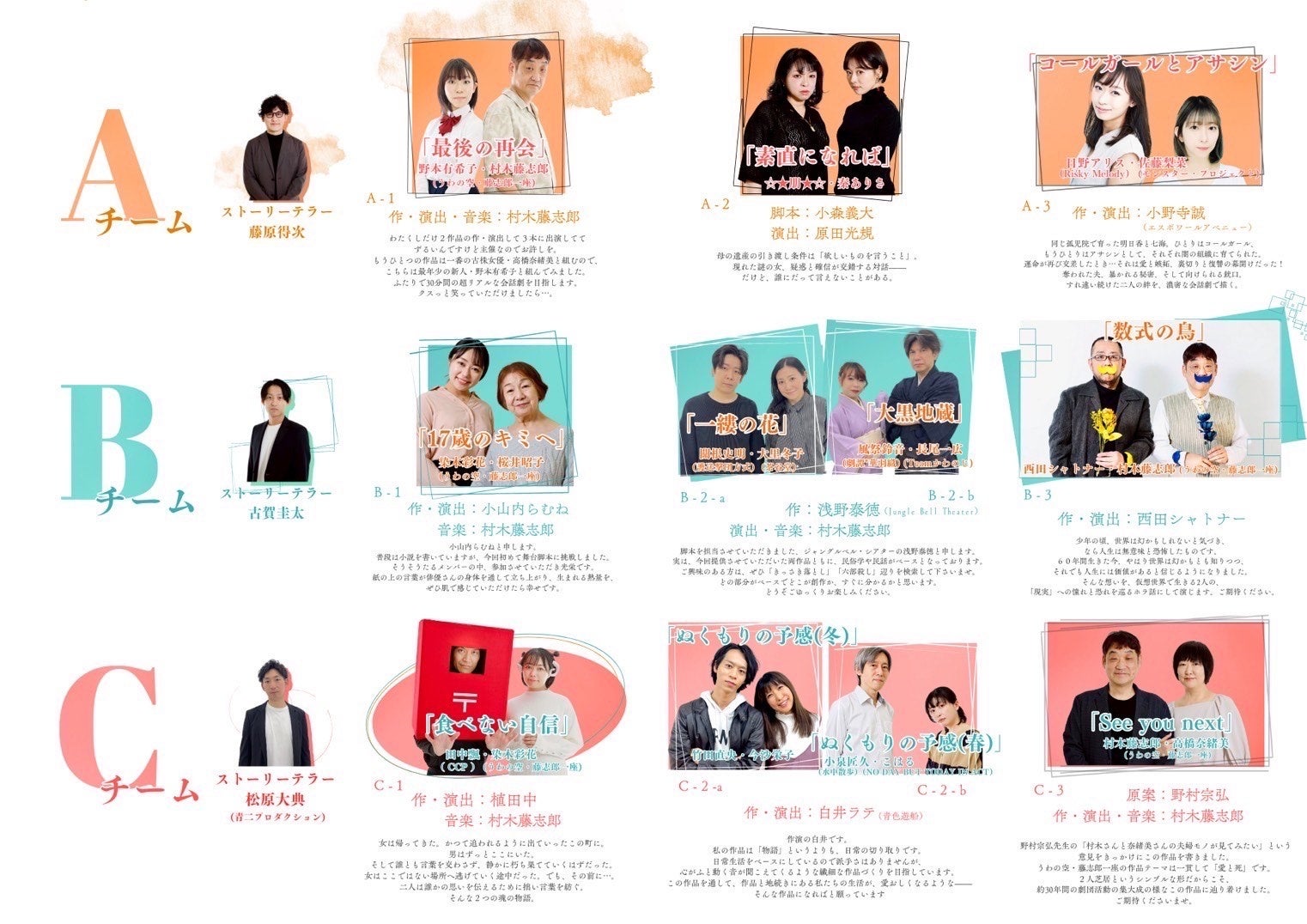 大里冬子、風祭鈴音、小泉匠久、古賀圭太、こはる、今沙栄子、桜井昭子、佐藤梨菜、關根史明、染木彩花、高橋奈緒美、竹田直央、田中飄、☆★朋★☆、長尾一広、西田シャトナー、野本有希子、秦ありさ、日野アリス、藤原得次、松原大典、村木藤志郎