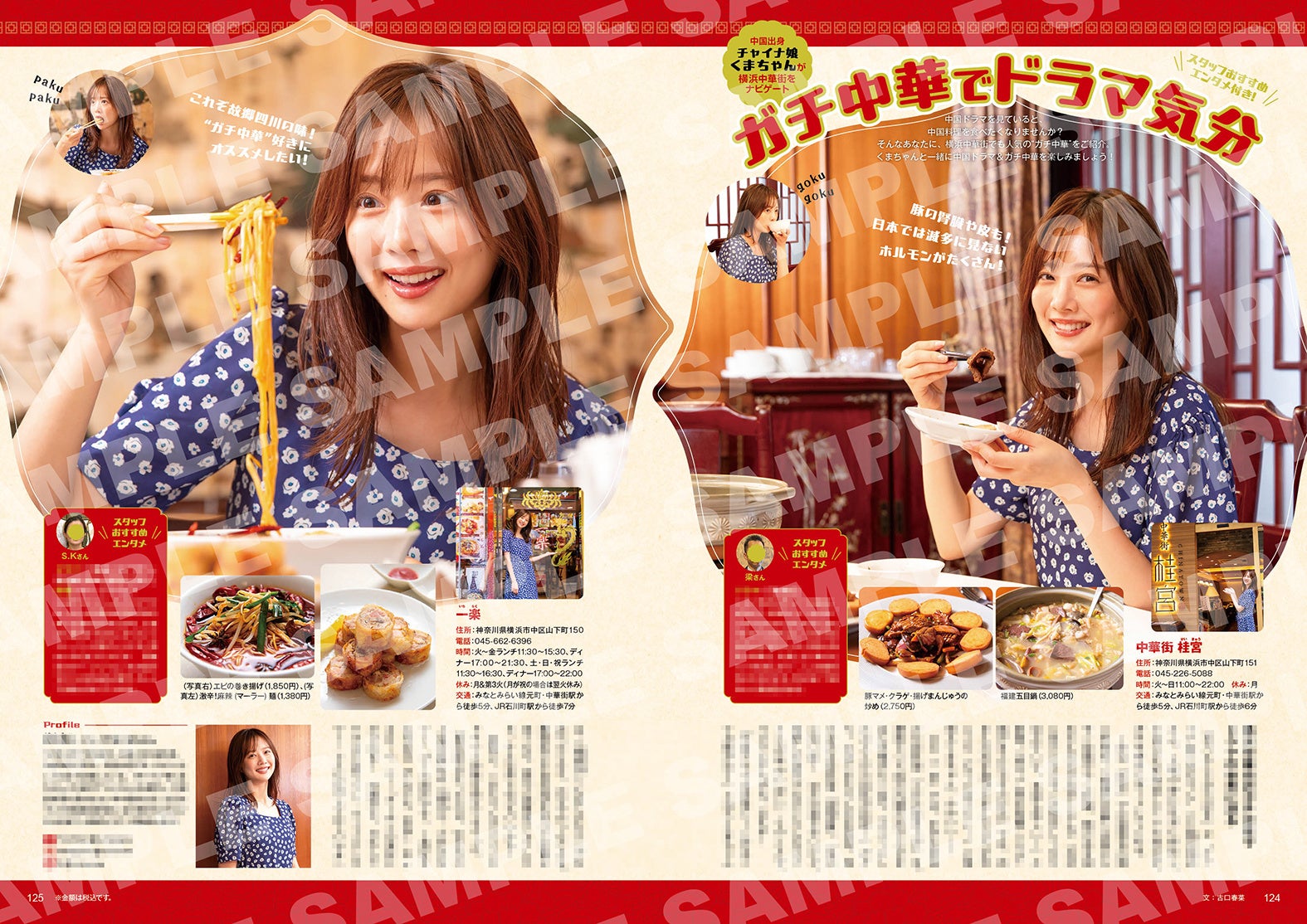 グルメ特集では、「中華街 桂宮」の豚ホルモン数種や干し牡蠣、鴨の血を固めたものなど具だくさんの福建五目鍋(3,080円/税込)、くまちゃんの出身地でもある四川省の料理が味わえる「一楽」の激辛!麻辣 (マーラー) 麺(1,380円/税込)、そのほか本格的な“ガチ中華”を堪能できるお店をご紹介。