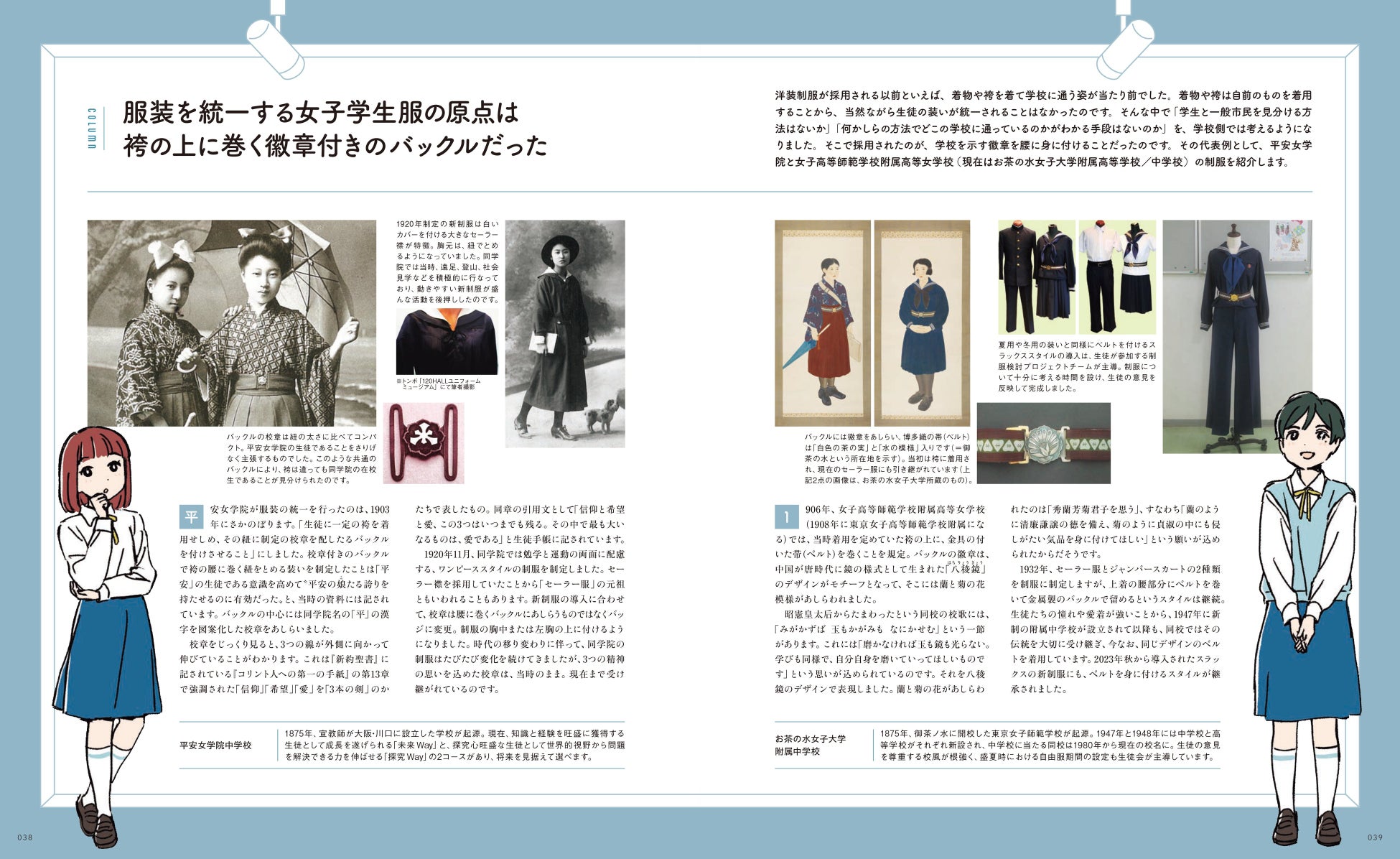 また、コラムページでは、制服以前から存在していた学校指定のベルトを袴に巻く装い、戦時中における「へちま襟」「もんぺ」の着用義務、1960年代から始まった男子学生のブレザー化、1970年代後半に流行した「変形学生服」、学生服メーカーが1980年代に注力していた「S.I.(スクールアイデンティティー)」活動、1990年代における「着崩しブーム」についても、各方面への取材をもとに詳しく解説しています。