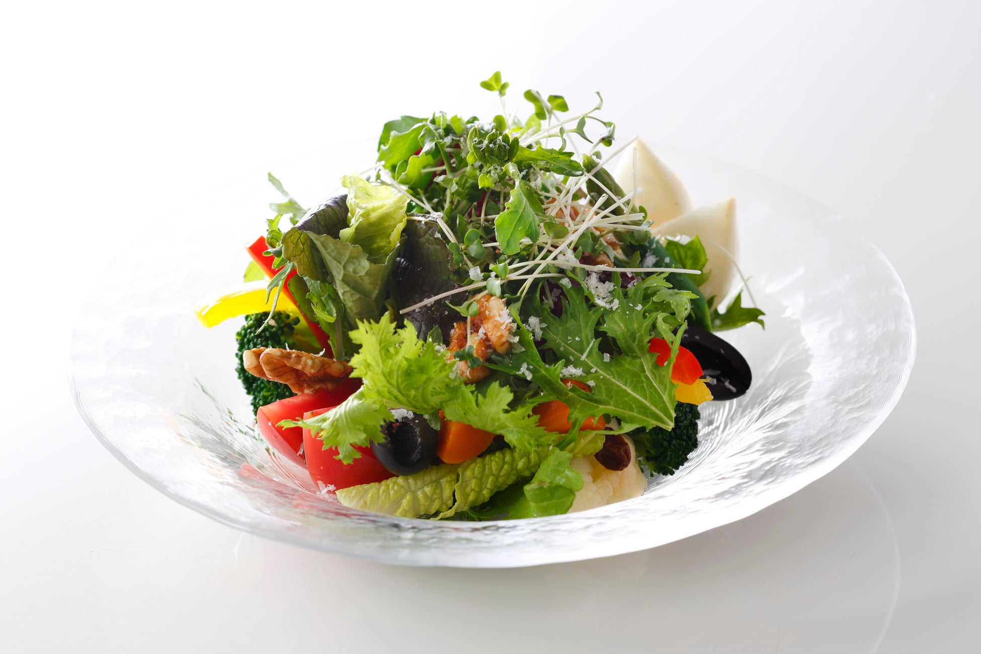 山梨県上野原市にあるホテルニューオータニ専用の畑で収穫される完全無農薬のサラダは、抜群の鮮度はもちろんのこと、野菜そのものの味が濃く、噛むほどに旨み広がり、野菜が持つ本来の味と力強さを感じられます。朝の目覚めにぴったりの健康野菜をトッピングやホテル特製ドレッシングとともにお召し上がりください。