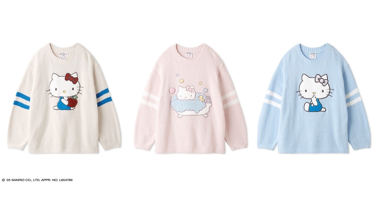 りんごを持ったり、泡風呂に入ったり、お座りポーズしたりと表情豊かなハローキティを描いた、可愛さがあふれるニットプルオーバー。
