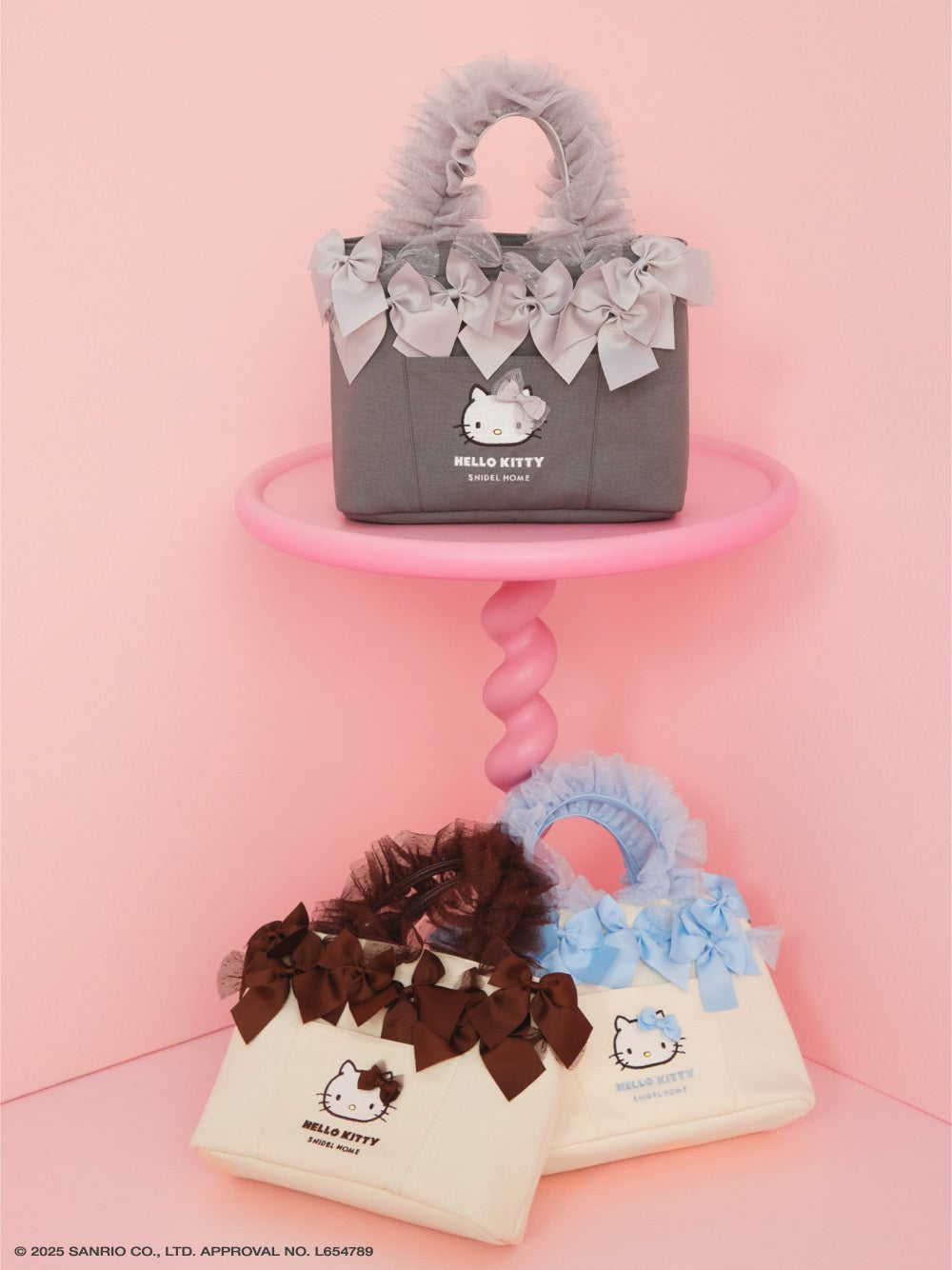 ライトブルーのカラーをメインに、ハローキティの愛らしさが溢れるグラフィカルなデザインで揃えたスペシャルコレクションは、トレードマークでもあるリボンをサテンで表現しフェミニンさをプラス。