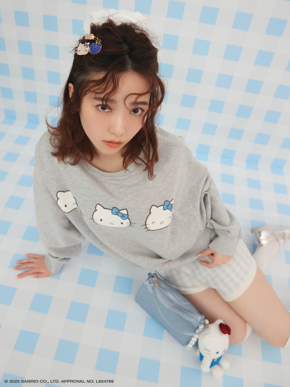 トップスは胸元にハローキティの顔、左袖口にダブルネームのロゴ刺繍入り。