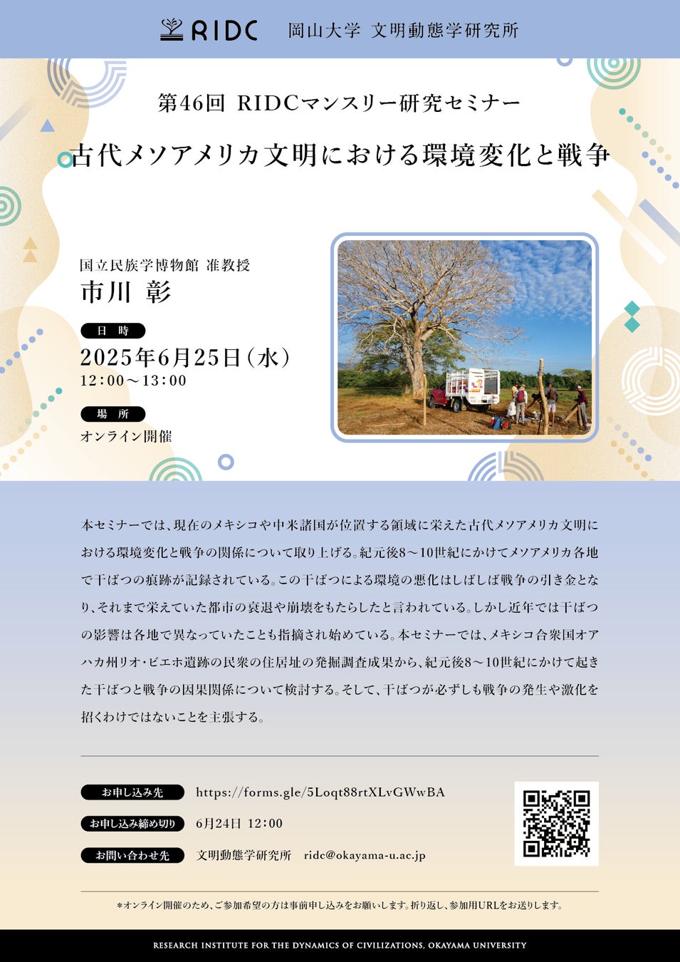 【岡山大学】高等先鋭研究院 文明動態学研究所 第46回RIDCマンスリー研究セミナー「古代メソアメリカ文明における環境変化と戦争」〔6/25,水 オンライン開催〕