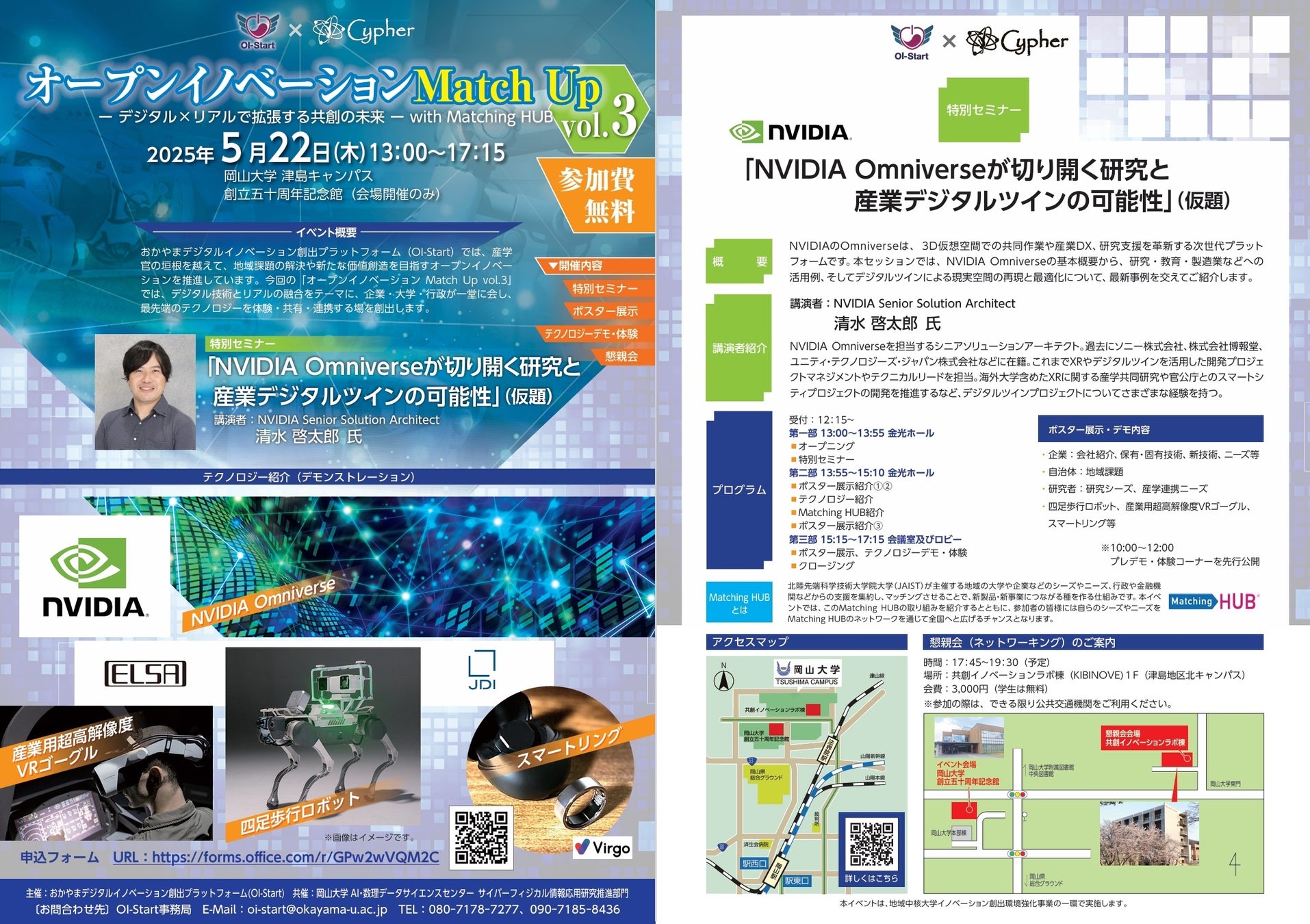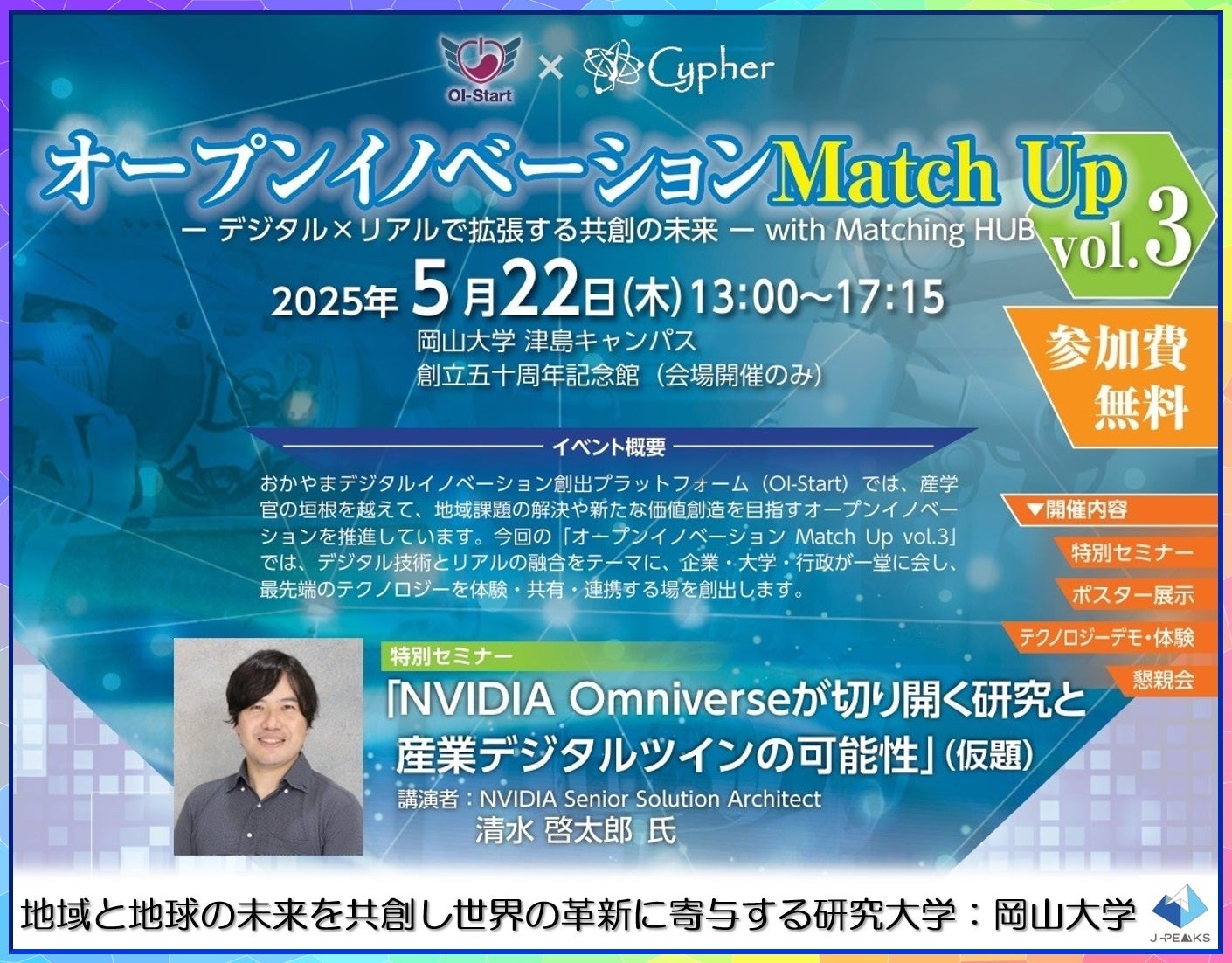 国立大学法人岡山大学(本部:岡山市北区、学長:那須保友)は、岡山県が設立し、本学が運営するおかやまデジタルイノベーション創出プラットフォーム(OI-Start)は、2025年5月22日(木)にNVIDIA × 四足歩行ロボット × VRデバイス体験 最先端を“その場で体験”できる共創イベント オープンイノベーションMatch Up vol.3を、本学津島キャンパスの創立五十周年記念館で開催します。