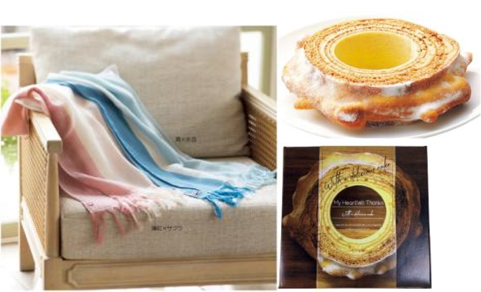 今治ラインカラーマフラー(薄紅×サクラ、青×水色)&バームクーヘン菓子の樹