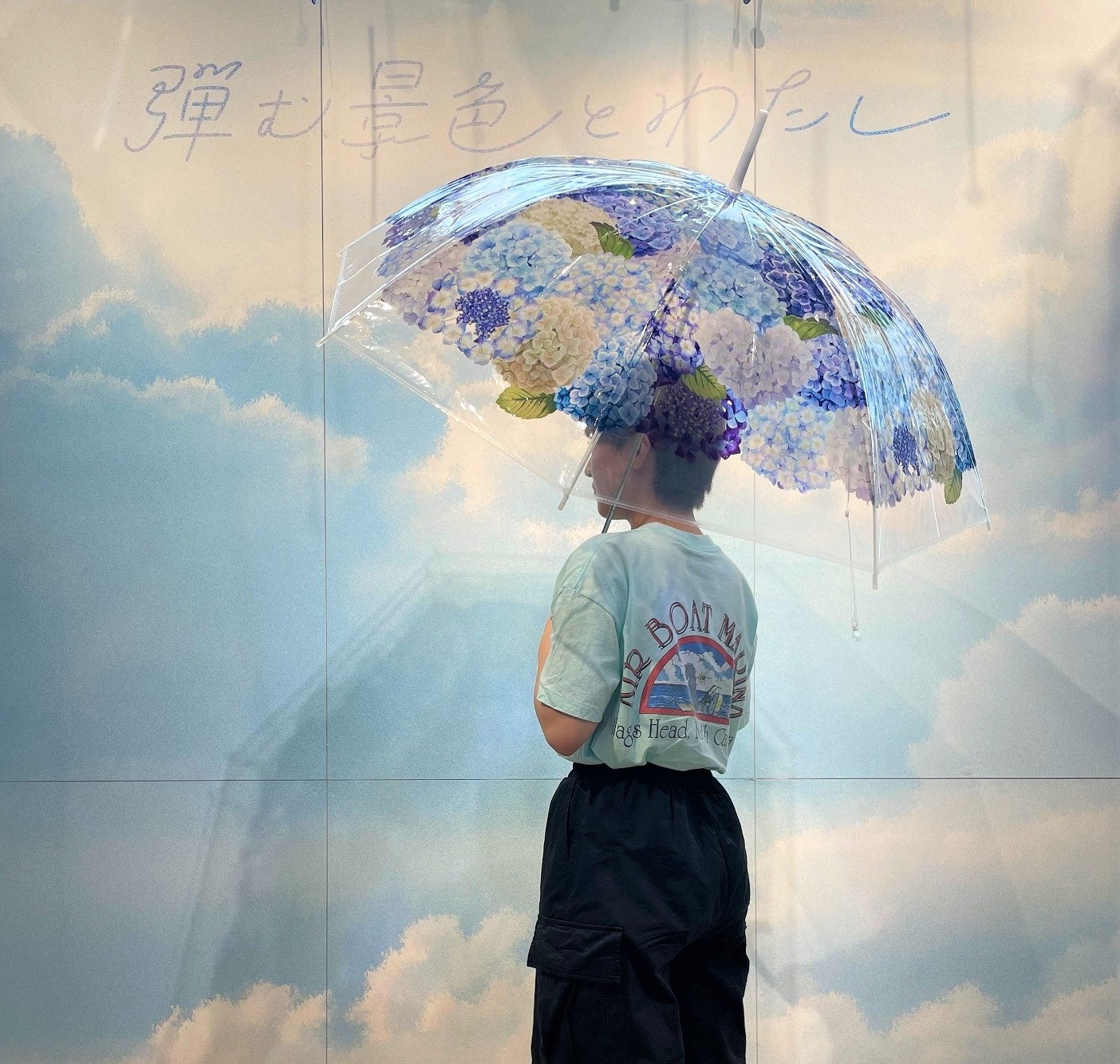 見上げると、SNSで目にする「紫陽花の傘」はじめ、ユーモア雑貨ブランドYOU+MORE!透明傘シリーズのアンブレラスカイが展開されています。