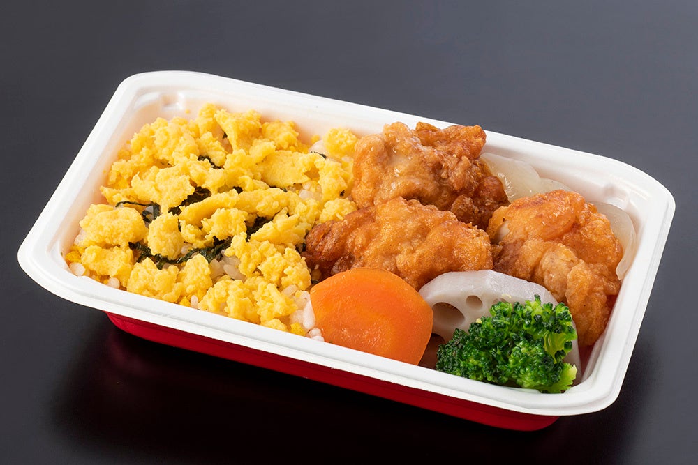北海道の唐揚げ“ザンギ”を使った「根菜とザンギの玉子そぼろご飯」は、醤油でしっかりと下味をつけて調理しているのが特長で、野菜を多めにし、ザンギの衣を薄くするなど、ヘルシーに仕上げています。