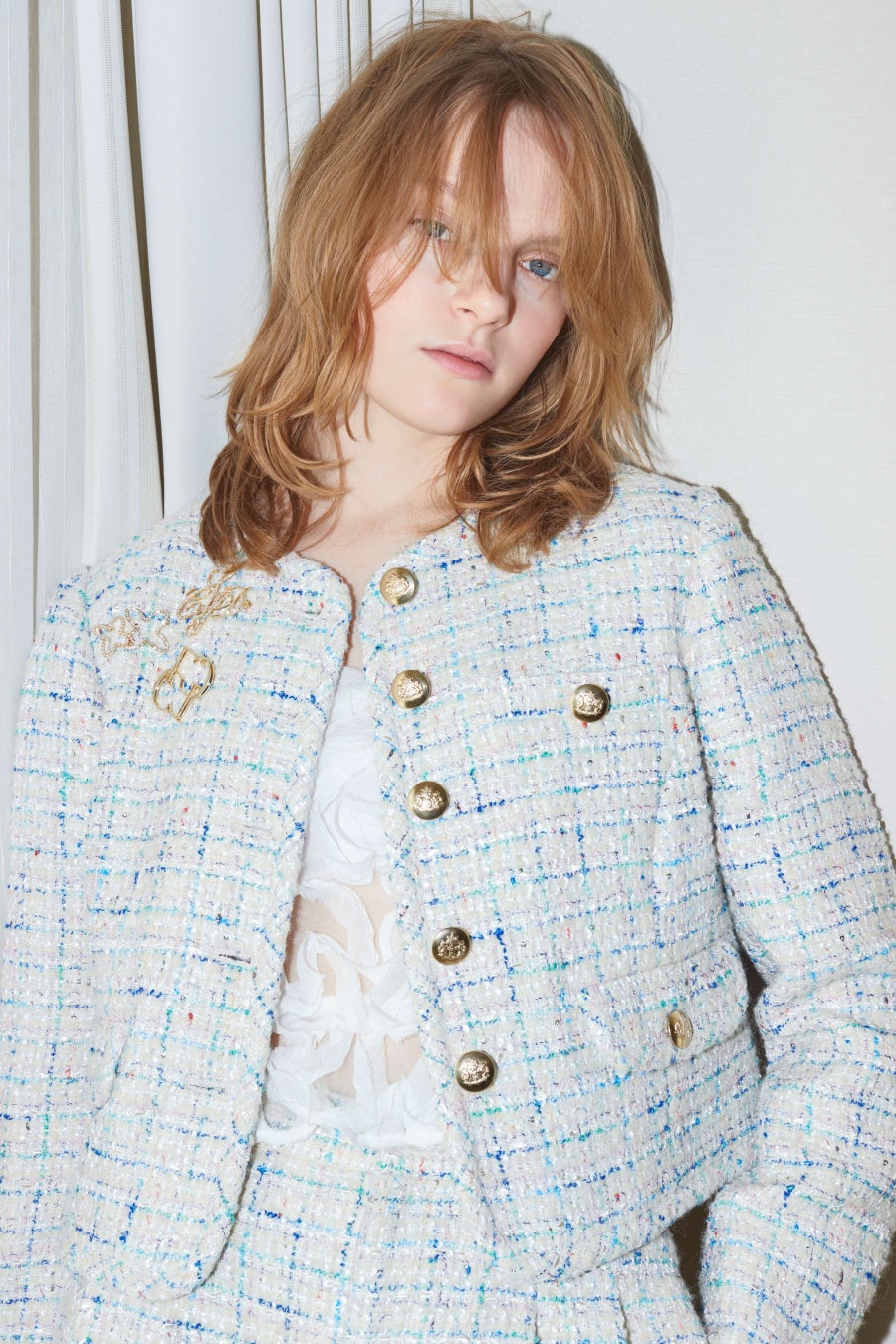 甘やかなハッピーカラーのミックスツイードやゴールドラインが走るファンシーツイードなど