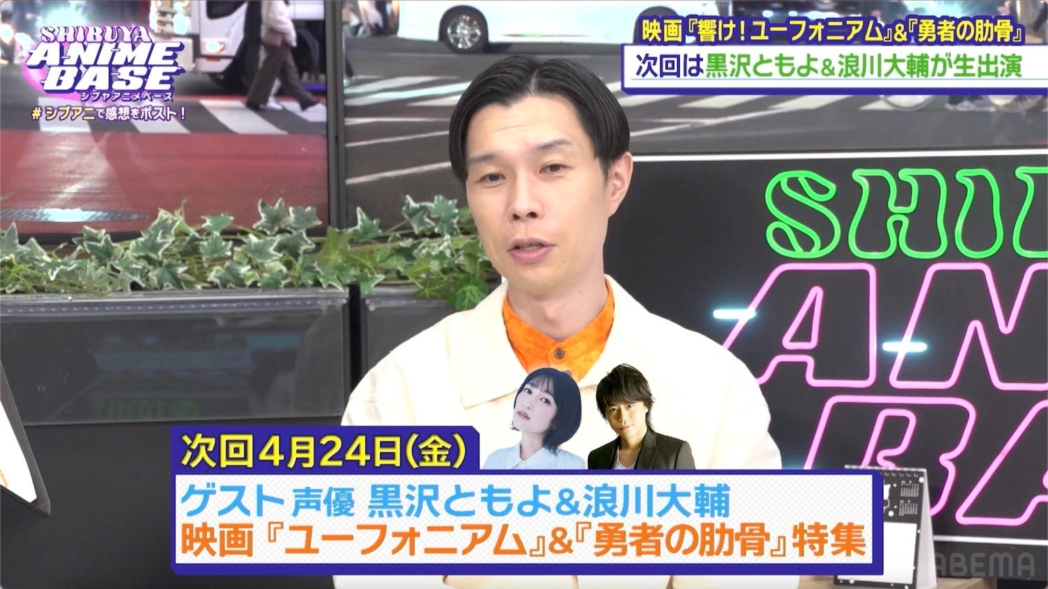 次週は休止回となり、4月24日(金)放送の『SHIBUYA ANIME BASE』#83は、ゲストに声優・黒沢ともよと浪川大輔が登場することが発表に。かねてより「一番好きな声優は浪川さん」と公言している岩井は、「浪川さんがテレビバラエティに出る時は、絶対付き添わせてくださいって言っている」と溢れんばかりの“浪川愛”を爆発させています。ぜひお楽しみに。