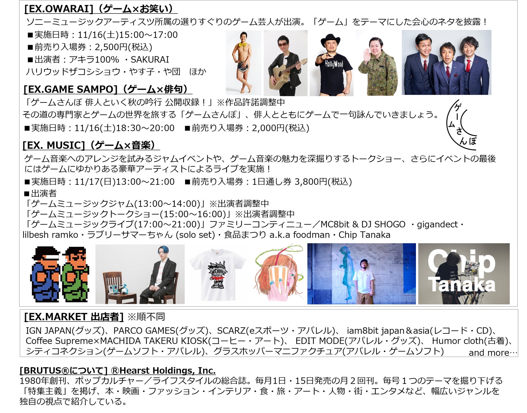 「ゲーム×アパレル」「ゲーム×アート」「ゲーム×フード」など、幅広いジャンルのゲーム関連アイテムが集結するマーケットイベントや、ハリウッドザコシショウややす子をはじめ、ゲームネタを持つ芸人たちによるお笑いライブ、「ゲームさんぽ」の公開収録、「ゲーム音楽」をテーマにしたライブやトークショーなど、「BRUTUS GAME STYLEBOOK 2023『ゲーム、どう楽しんでる?』」の紙面で特集した内容もリアルイベント化。