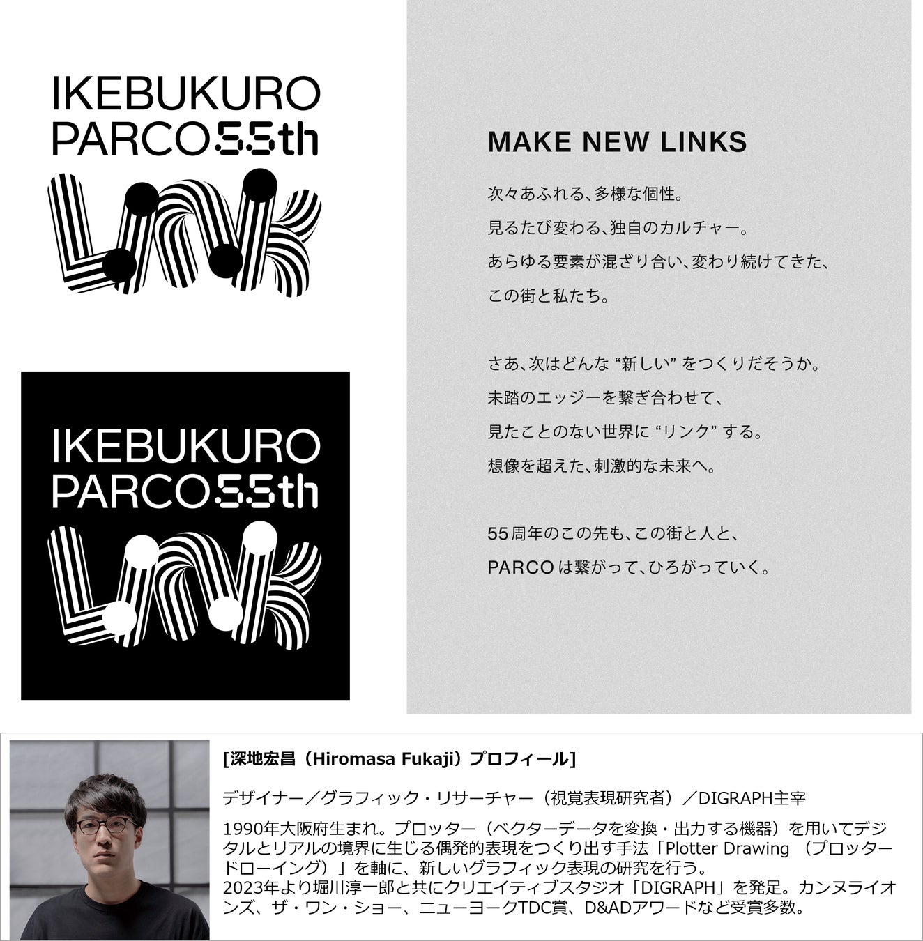 ロゴのデザインは池袋PARCO55周年ロゴと同様、クリエイティブスタジオ「DIGRAPH」の深地宏昌氏が務めています。