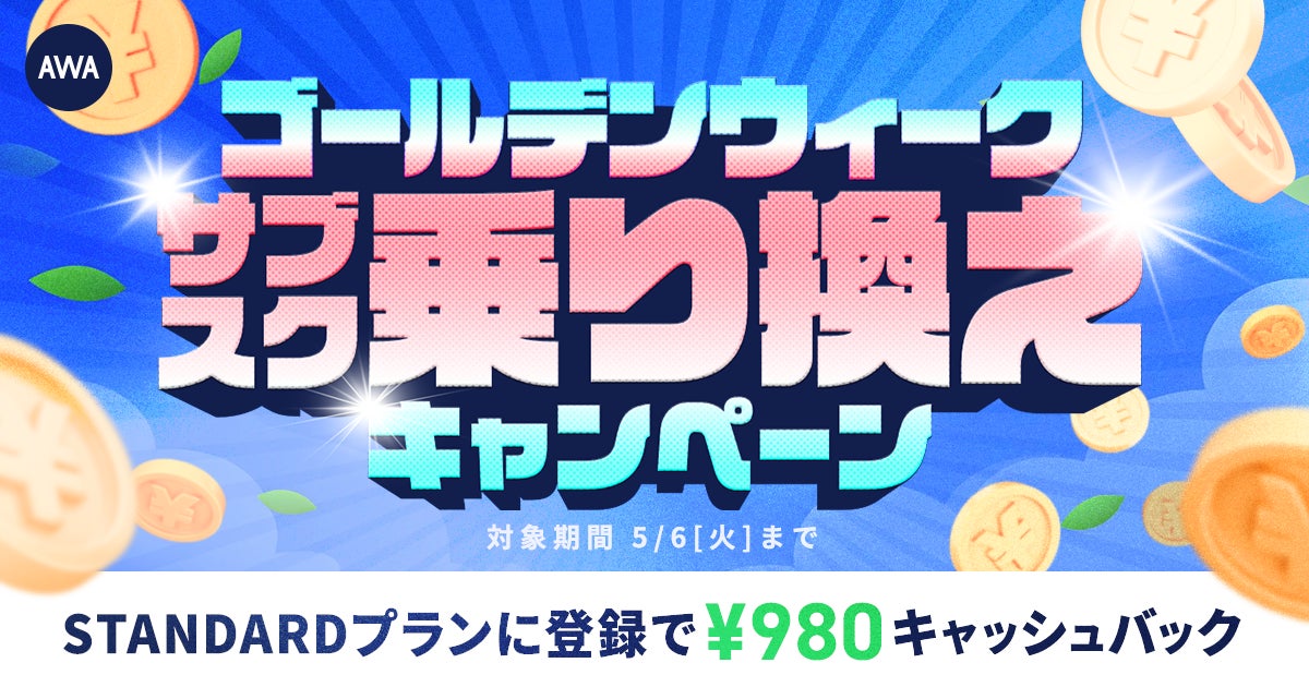【実質2ヶ月無料!?ゴールデンウィークサブスク乗り換えキャンペーン】AWA STANDARD会員に登録した方全員¥980キャッシュバック