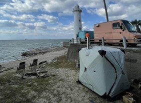 【開催概要】本イベントは、野間埼灯台に登ったり、海と灯台という絶景空間でアウトドアチェアに座って“チル”(まったりくつろぐ)したり、さらには、近隣の飲食店、お土産売り場等で使用できる割引・特典サービスが受けられる「灯台パスポート」の配布をしました。灯台の上から行う「菓子まき」では、灯台ホリデイ参加者の中から最大で5名様が灯台に登って菓子まきする貴重な体験となりました。また、灯台ホリデイ参加者に限り、海風呂に入ってととのうテントサウナのサービスも行いました。