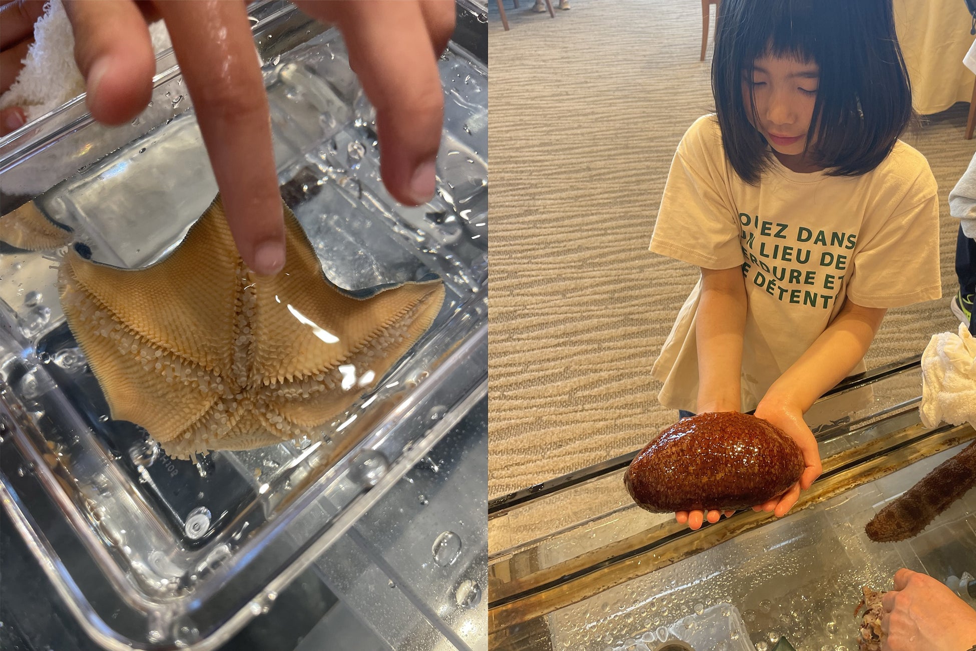 イベントのメインは、下田海中水族館の協力による「移動水族館」です。ヒトデ、ナマコ、カニ、エビなど磯の生き物を中心に、実物やパネルを展示します。水族館スタッフの説明に耳を傾け、実際に捕まえたり、触ったりすることができます。昨年初めて実施したところ、ヒトデやナマコに触るのは「ドキドキするけど面白い」というお子様がほとんどで、大人気でした。