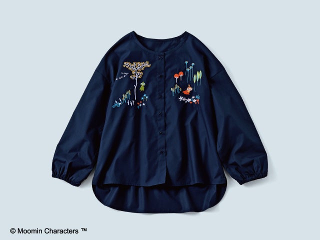 草原を走るミイとどこかへ向かうスナフキンが左右にデザインされたブラウスです。絵本のようなワンシーンを、濃紺の生地に繊細な刺しゅうで表現しています。