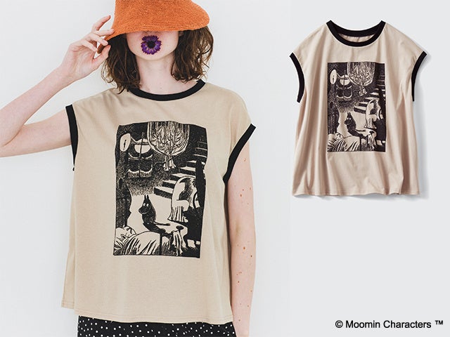 小説「ムーミン谷の冬」の挿し絵が大きくプリントされたTシャツです。インパクトのある柄を、ベージュ×ブラックの大人っぽい配色でおしゃれに仕上げています。全体の印象を引き締めてくれる衿と袖口のブラックのラインもポイントです。スカートにもパンツにも合わせやすいラフなサイズ感で、今どきの着こなしが楽しめます。