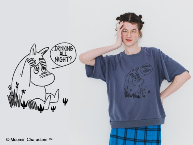 スモーキーカラーに切りっぱなしの袖やラグランスリーブが、リメイクした古着のような雰囲気のスウェットトップスです。着ると女の子っぽいシルエットに仕上がる絶妙なサイズ感が大人のカジュアルスタイルを盛り上げてくれます。胸にプリントされているのは、一晩中飲んで二日酔い(?)のムーミンです。いつものイメージとは違う、頭を抱えるポーズと表情がたまらなくかわいいデザインです。