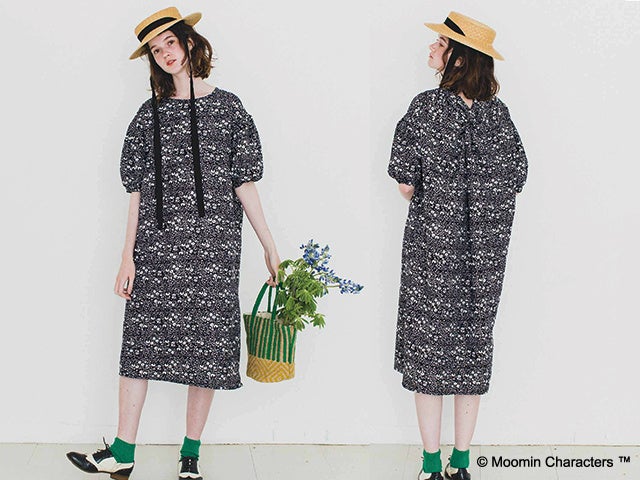 お花の間でリトルミイと小さないきものたちがかくれんぼしているようなデザインのワンピースです。上品な小花柄に見えるので、こっそりムーミンの世界を楽しみながら、大人っぽく着こなすことができます。シンプルなようで、ぽわんとふくらんだ袖やリボンみたいな背中のクロスなど凝ったデザインも魅力です。