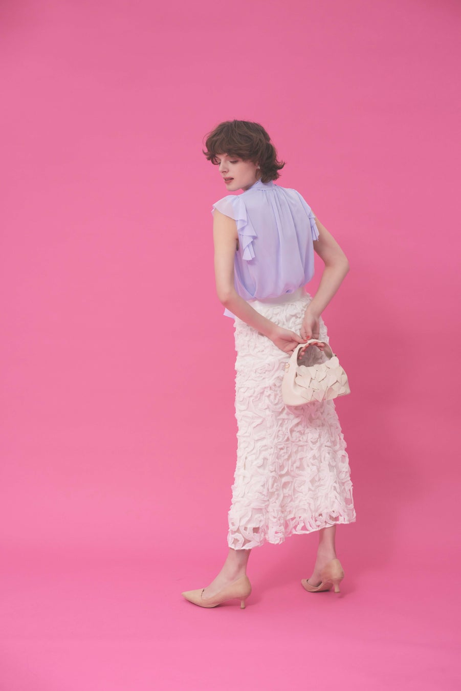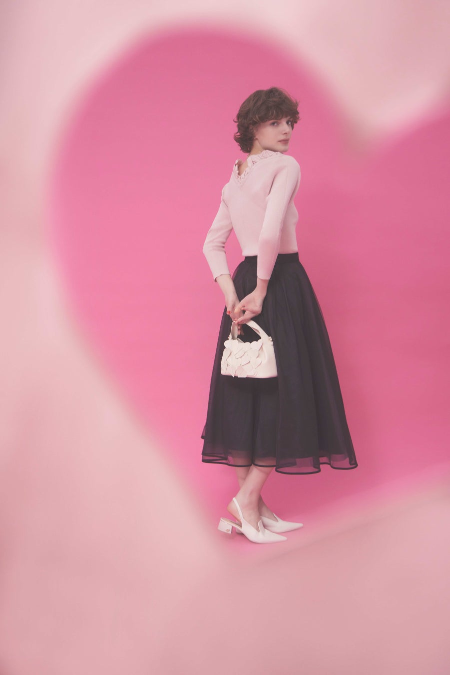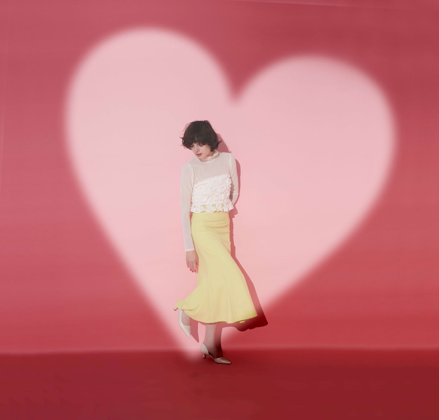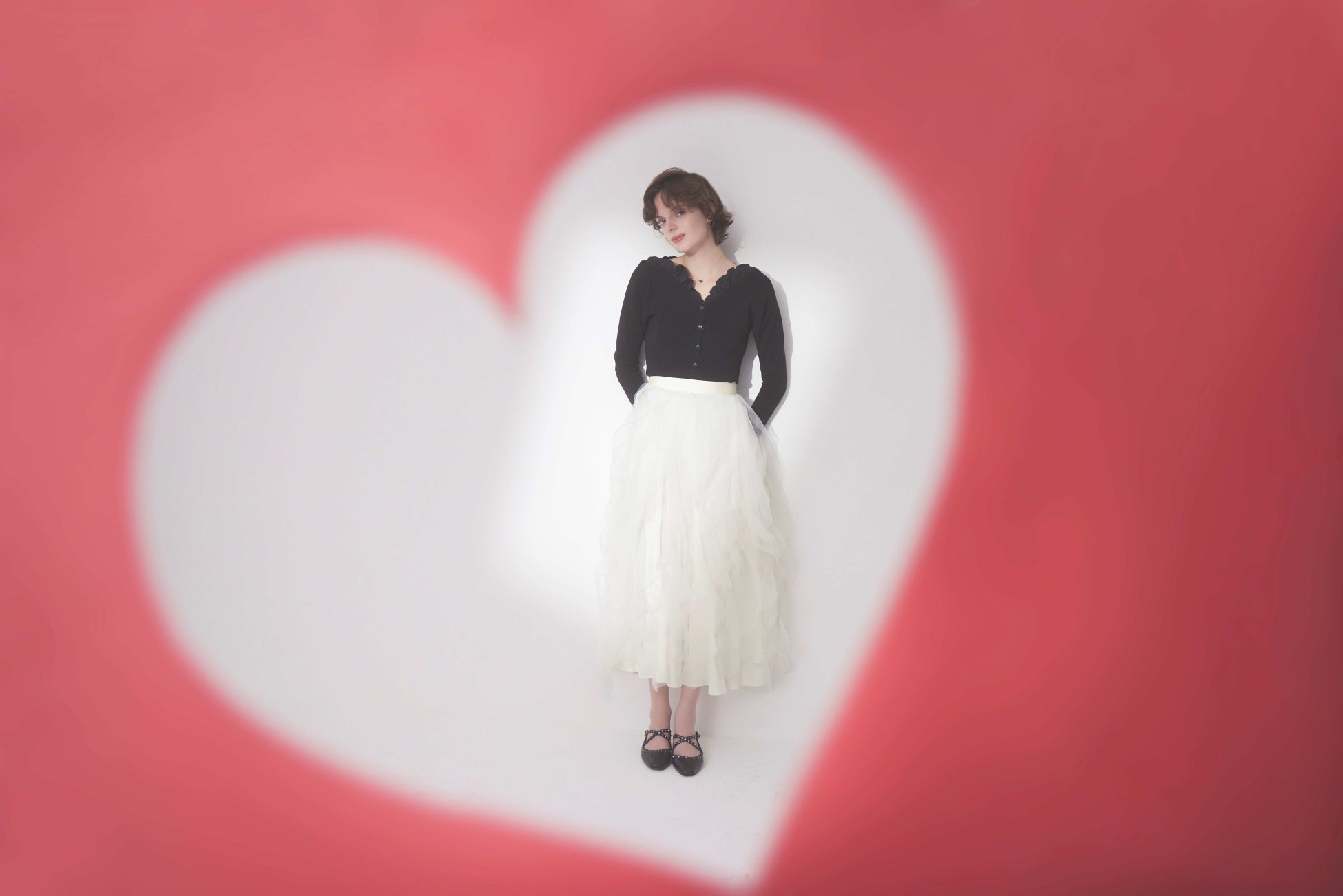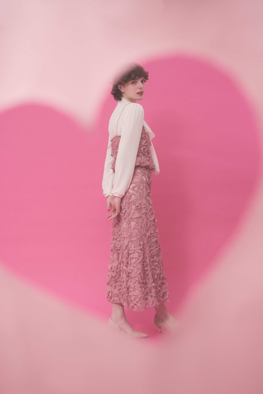 チュールにテープ状のシフォンでハート柄を描いたオリジナル刺繍生地によるビスチェとスカートのセットアップ。ハートのサイズ感やフリルの透け感、バランスなど細部までこだわりました。合わせるアイテムによってカジュアルにも着こなせて、乙女心をくすぐるアイテムです。