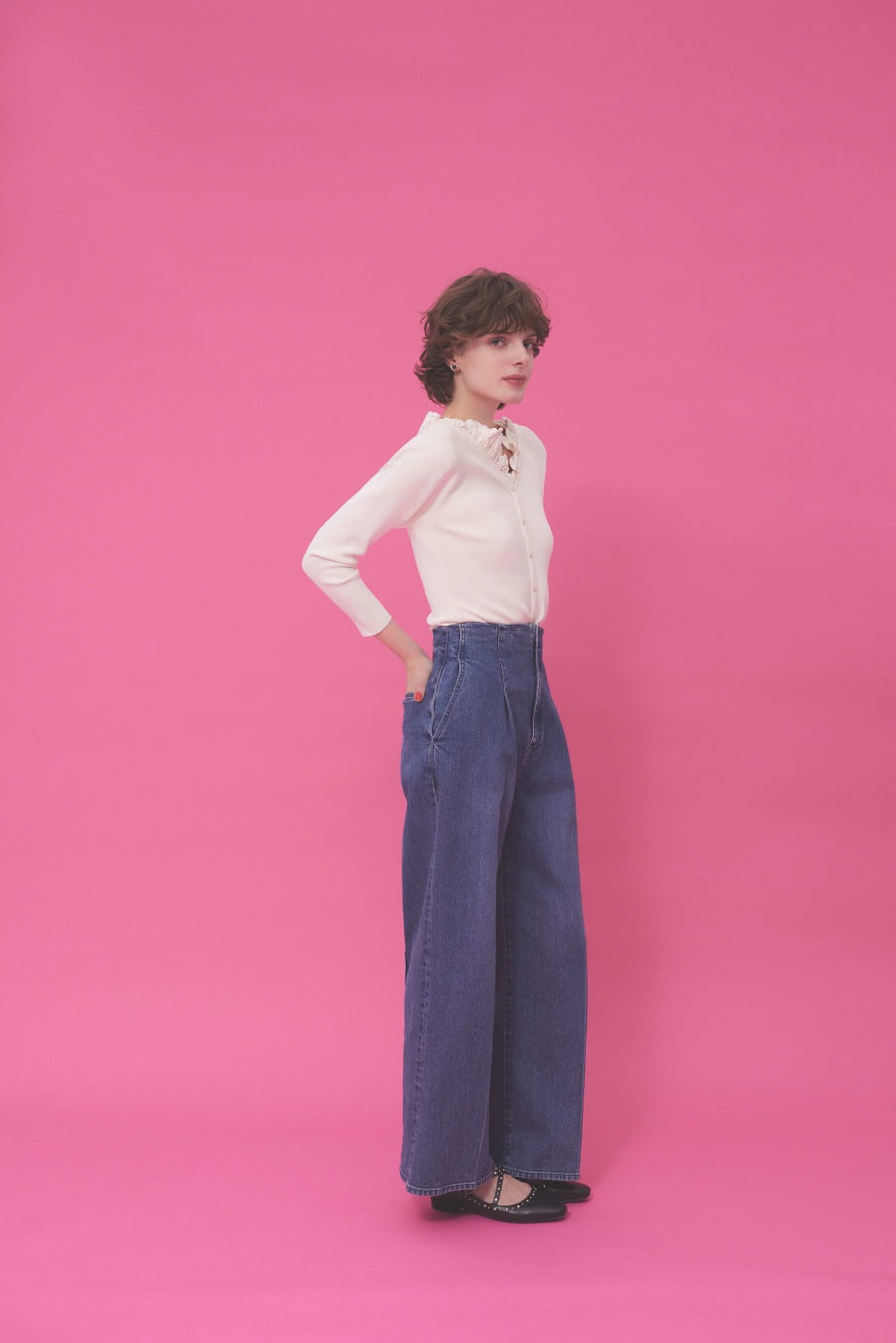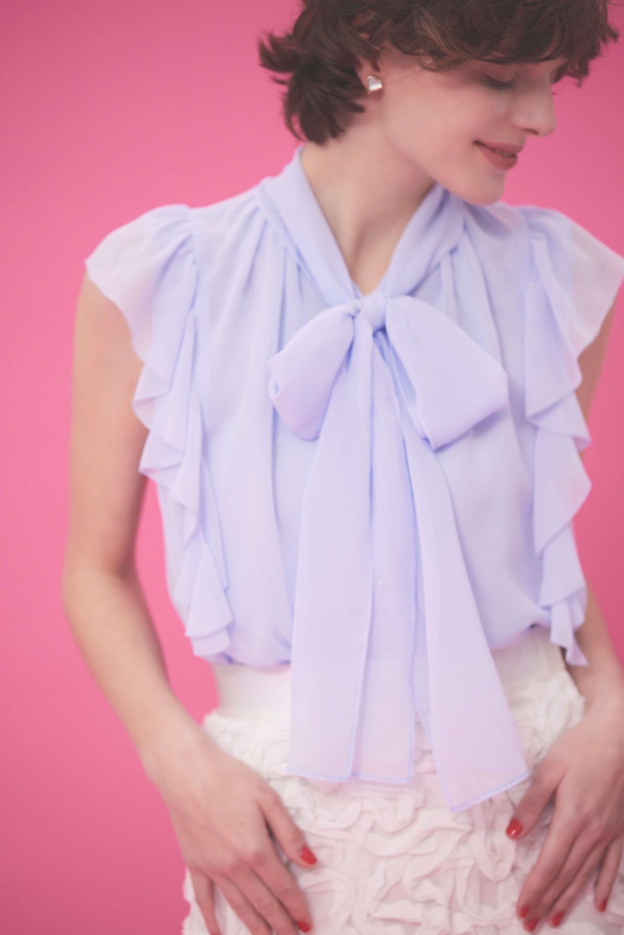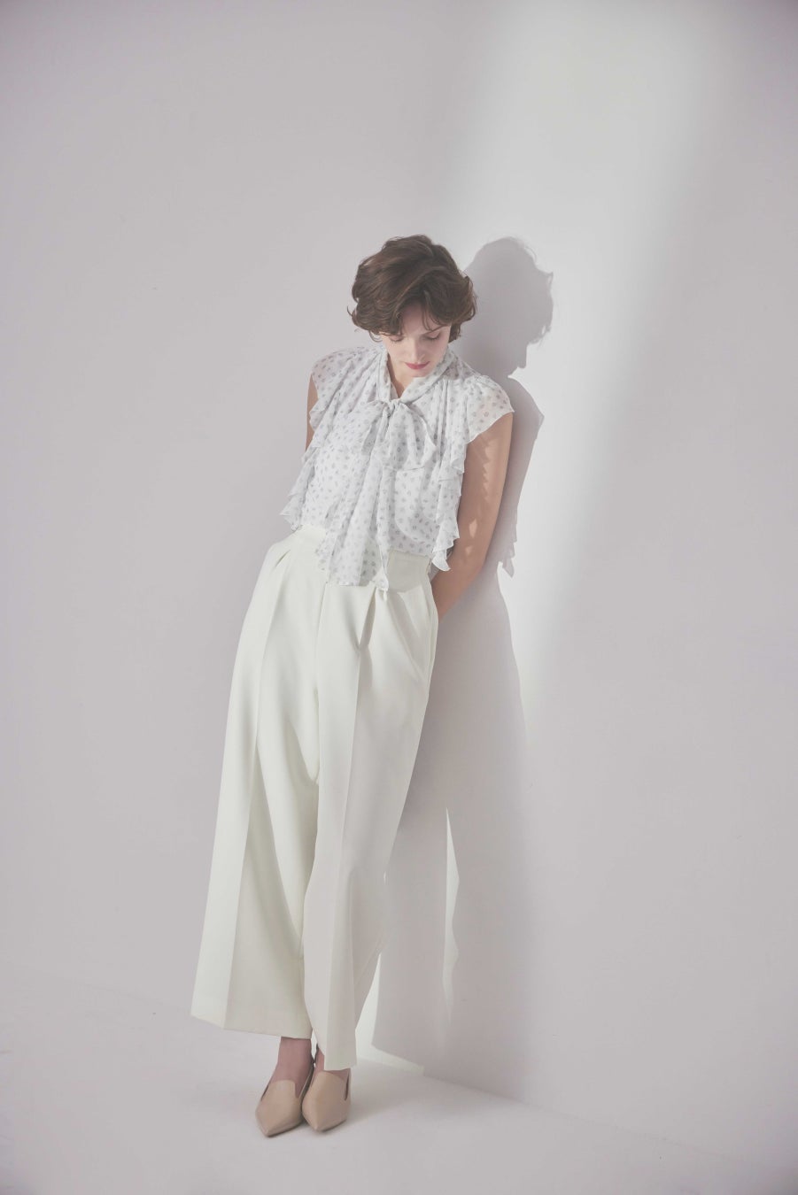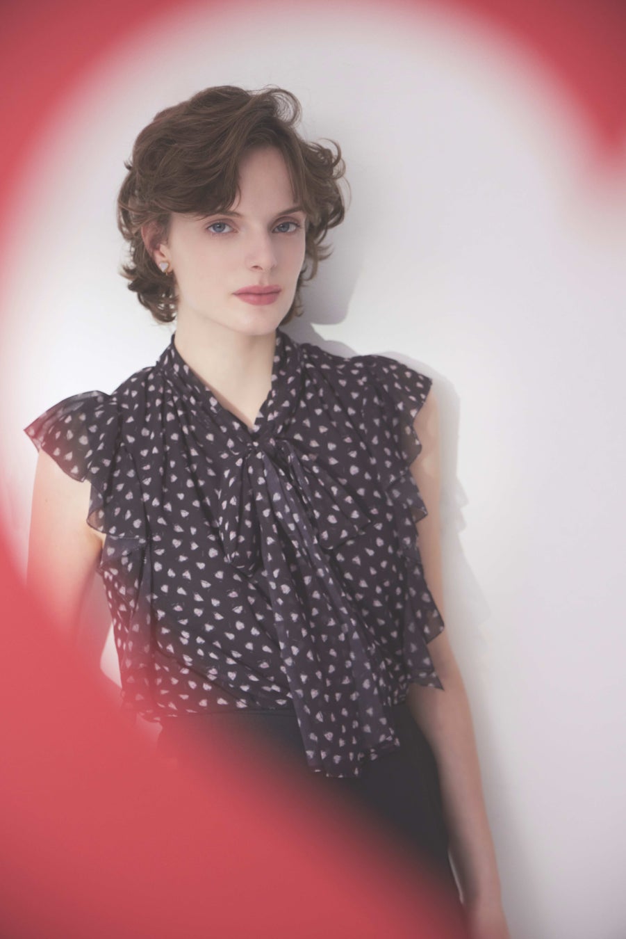 繊細なシフォンジョーゼットのブラウスは、HANAE MORIアーカイブのハートモチーフにCELFORDらしさを加えたオリジナルプリント。肩周りにシャープな切り替えを加え、ラッフルの端を垂らすように付けて動きのあるデザインに。柔らかなボウタイリボンが顔周りを華やかに印象づけます。