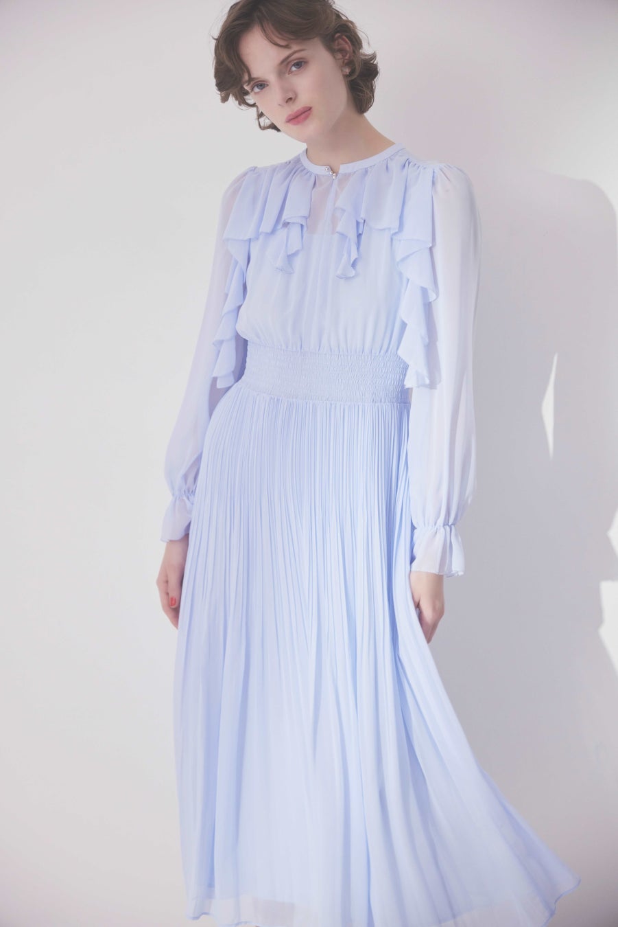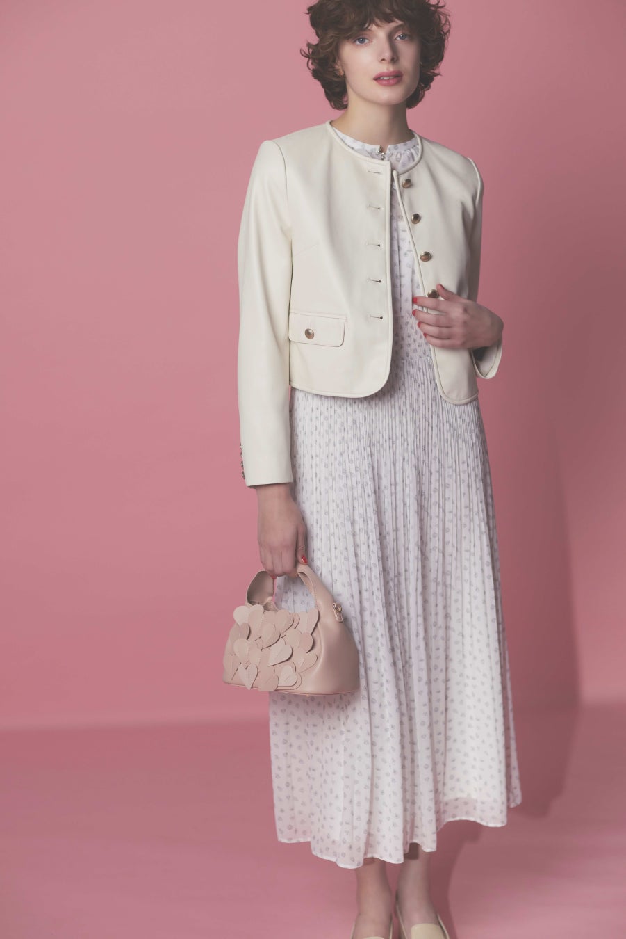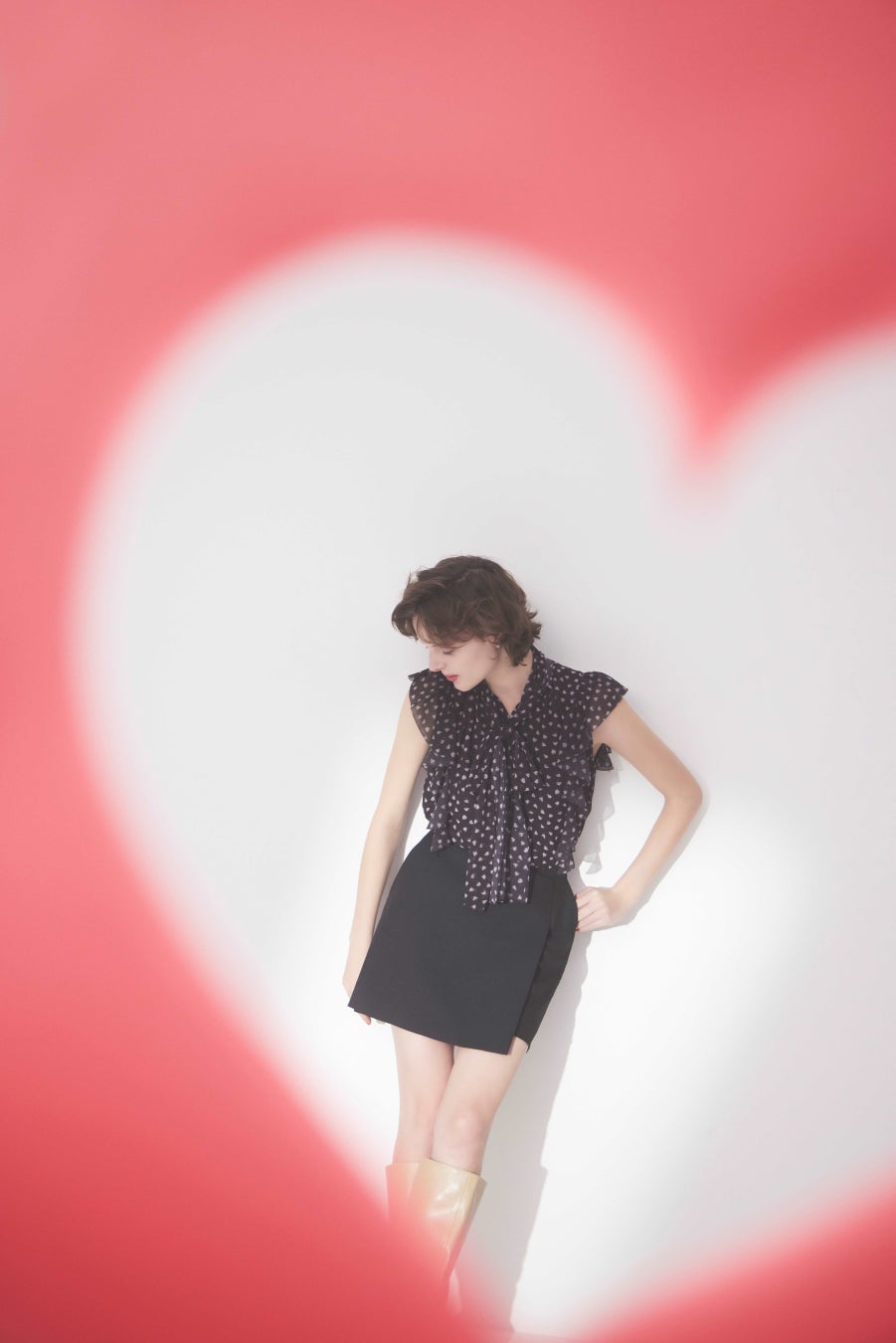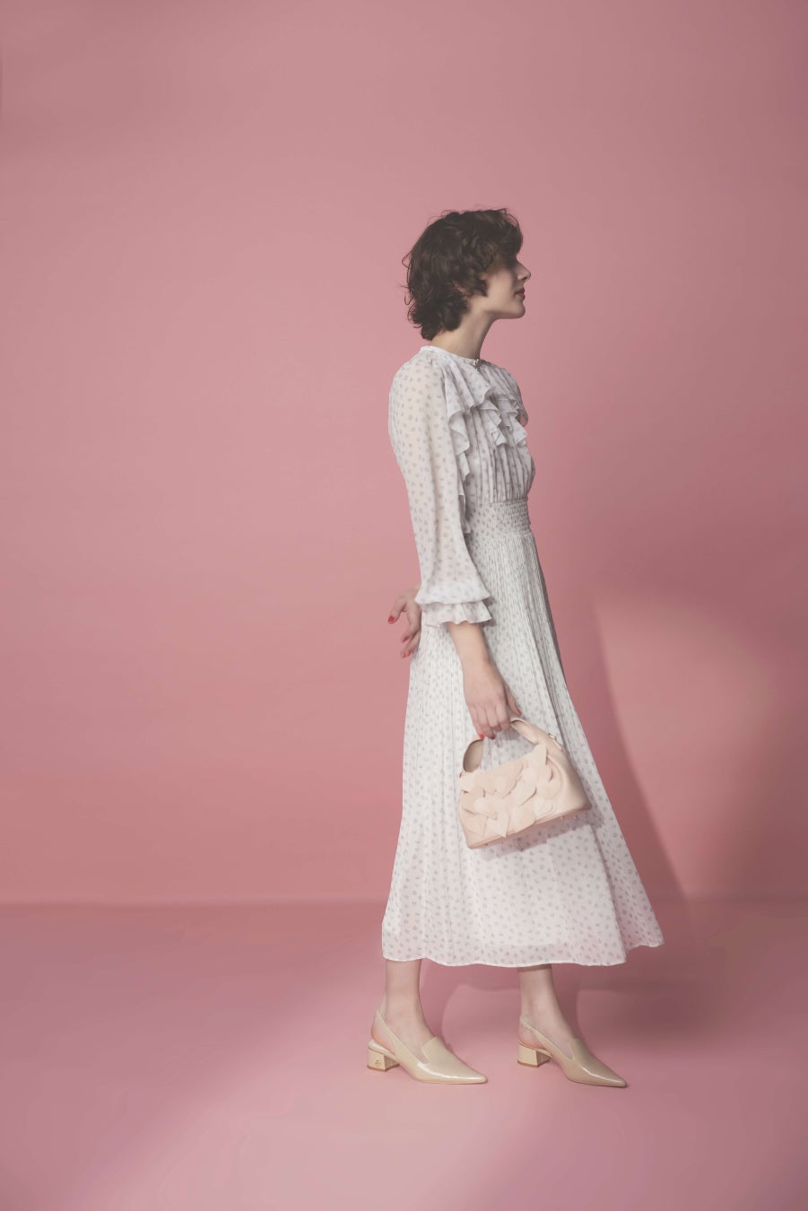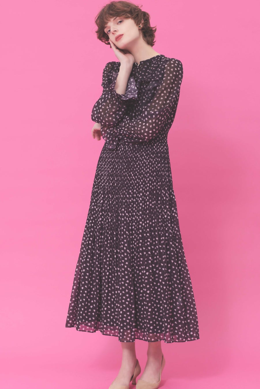 アートのように描かれたアーカイブのハートモチーフを、小さなドット状の総柄プリントに仕立てたワンピース。肩や袖下にはラッフルを垂らすように施し、スカートにはウエスト周りがすっきり見えるプリーツを入れるなど、ドレッシーなあしらいを随所に。長く大切に着たくなる一着です。