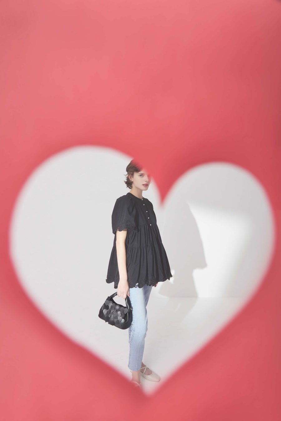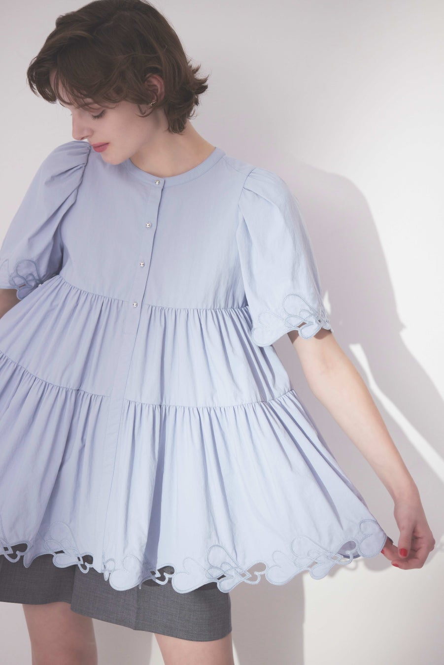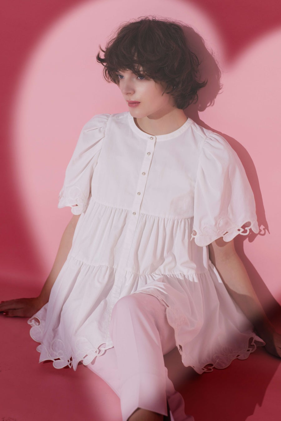 CELFORDで人気のティアードチュニックに、さりげなくハートのモチーフを融合。袖口と裾にレーン状に繋げたハートをチェーンステッチ刺繍で落とし込み、さらにカットワークを施してスカラップデザインに仕上げました。