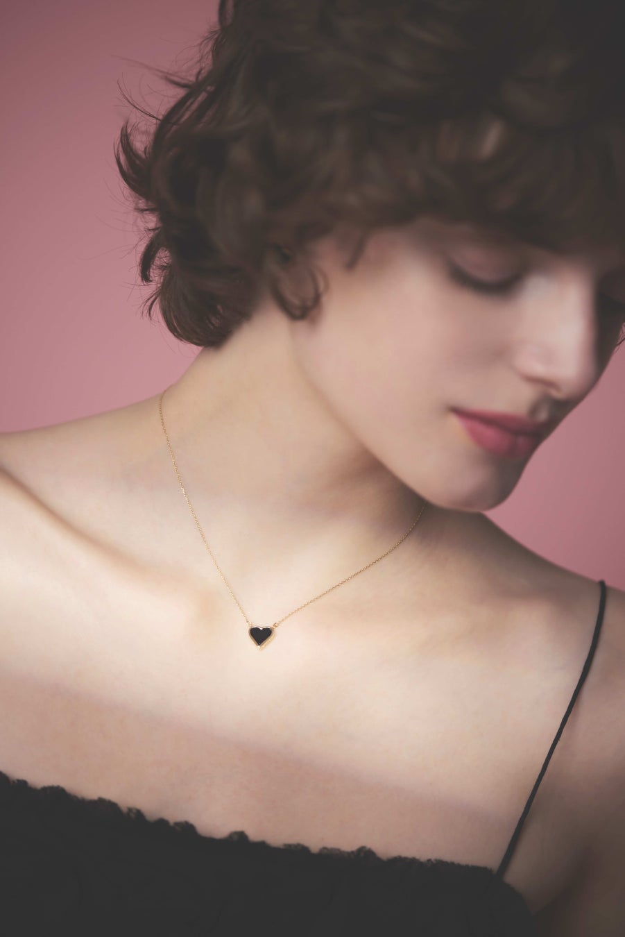 ジュエリーライクなブラックオニキスを使用し、アーカイブで使用されていたハートモチーフをネックレスに落とし込みました。ハートの枠の外側には左右にCELFORDとHANAE MORIのロゴを刻印するなど、細部にまでこだわりが光ります。