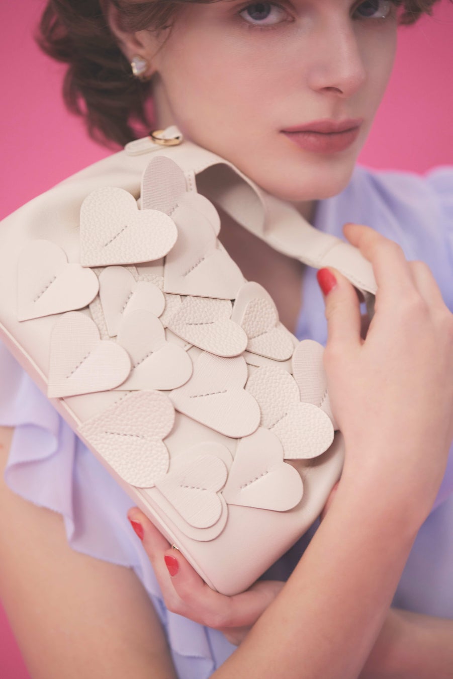 ハートモチーフをふんだんに盛りこんだ、小ぶりながらも存在感を放つキュートなバッグ。さまざまな質感の素材でつくられたハートは奥行を感じさせ、より一層華やかな印象に。スマートフォンが入るサイズのオープンポケットやショルダーストラップなど、使いやすさにもこだわりました。