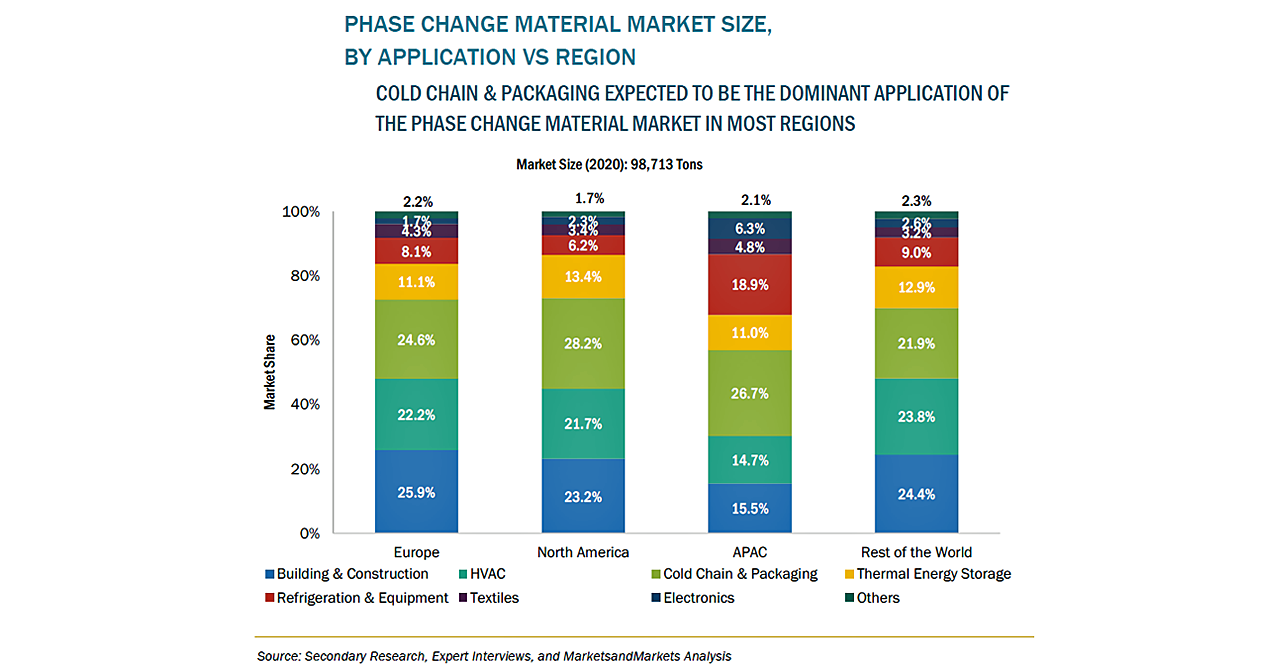 相変化材料市場の成長は、温度制御のための使われる用途の増加に牽引されています。建築物に相変化材料を使用することで、室内の温度調節が可能になります。日中と夜間の環境温度の変化を利用して材料の相を変化させ、その過程でエネルギーを放出・吸収します。相変化材料を用いた温度調節により、室温維持のための冷暖房機器の負荷が軽減されます。