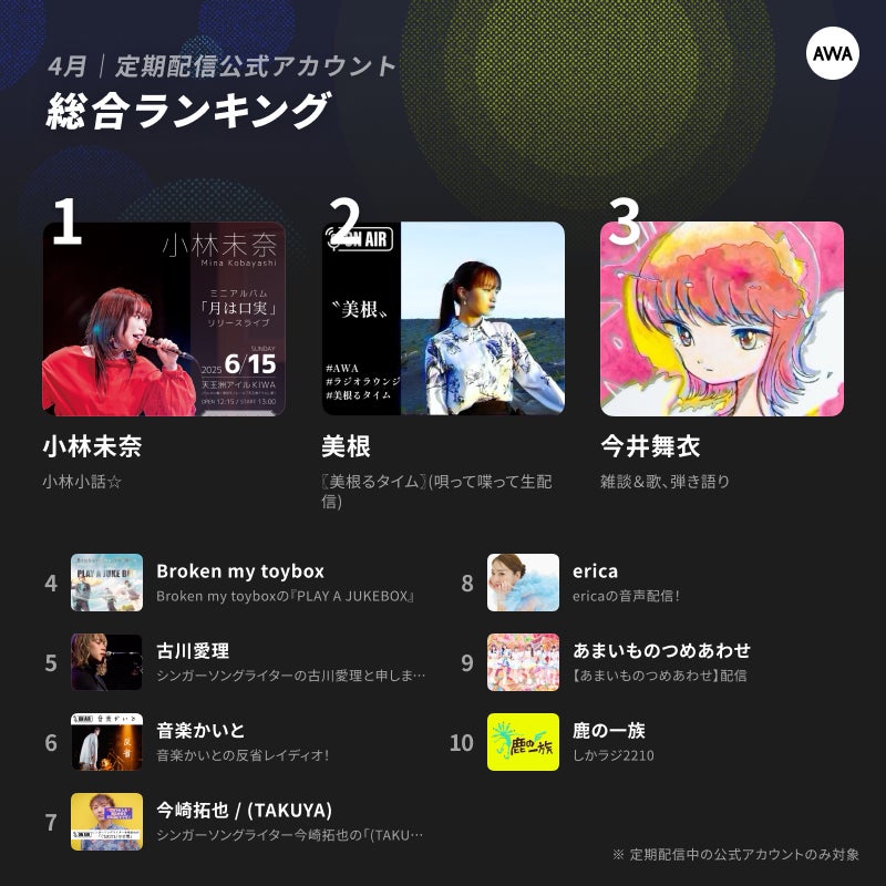 AWA株式会社(本社:東京都港区、代表取締役CEO:冨樫晃己)が運営する、サブスクリプション型(定額制)音楽ストリーミングサービス「AWA(アワ)」は、2025年4月1日(火)から4月30日(水)までに開催された、音声ライブ配信を利用した「定期配信ラウンジ」※の視聴数、開催頻度、リアクション数、フラワーチャット本数などを総合して、2025年4月の定期配信AWAラウンジランキングTOP10を発表いたしました。