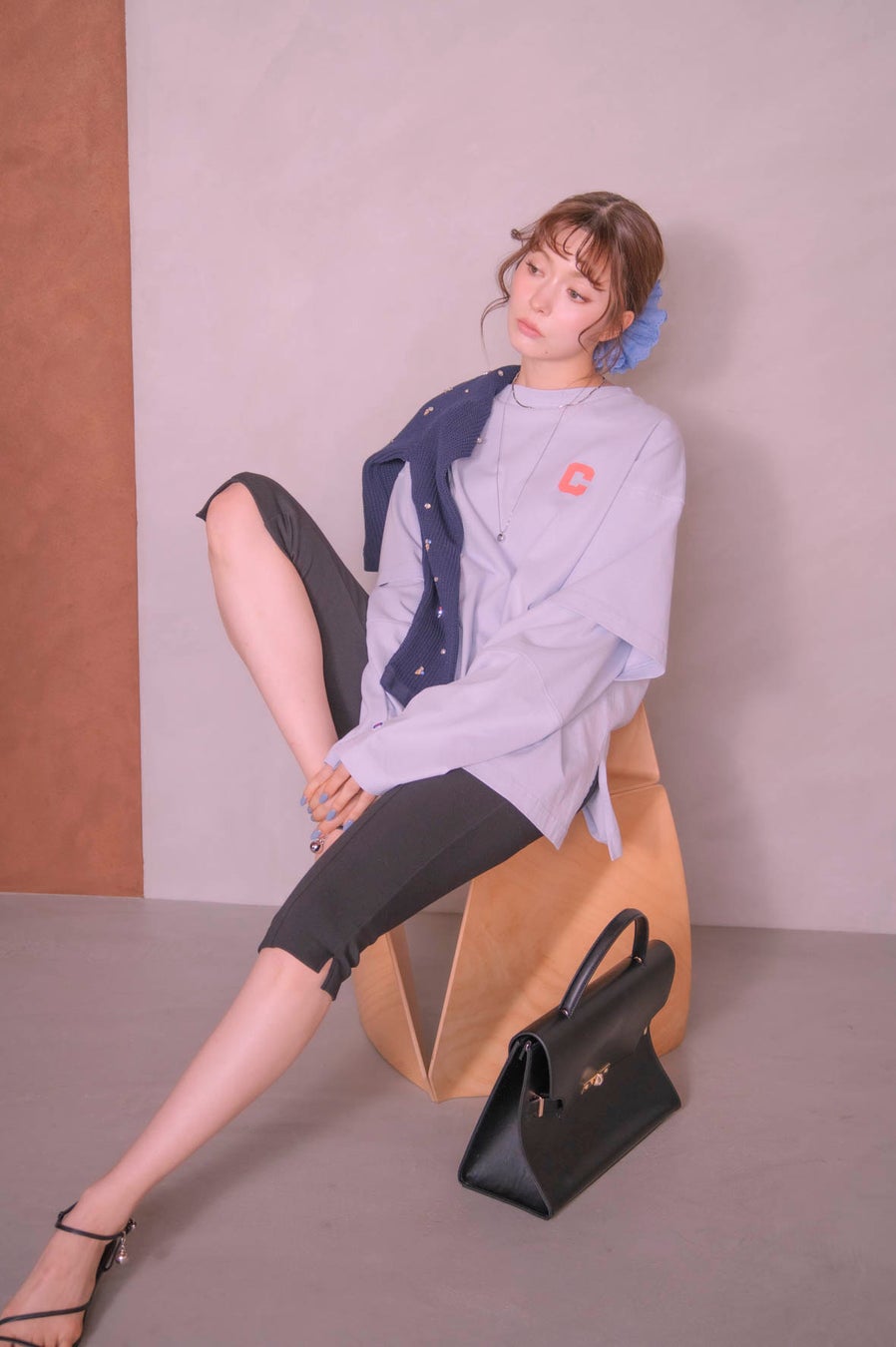 胸元と袖に入れた「C」のロゴがポイントのスウェットプルオーバー。カジュアルになりがちなアイテムこそ花柄刺繡のスカートを合わせることでFRAY I.Dらしいフェミニンなスタイリングに。