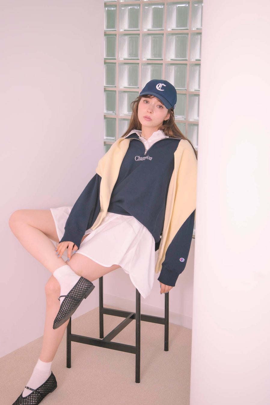 Championの代表格でもあるリバースウィーブ®のハーフジッププルオーバーは肌触りの良いコットン100%の裏起毛使用。ビッグシャツを重ね着してカジュアルフェミニンなムードに。