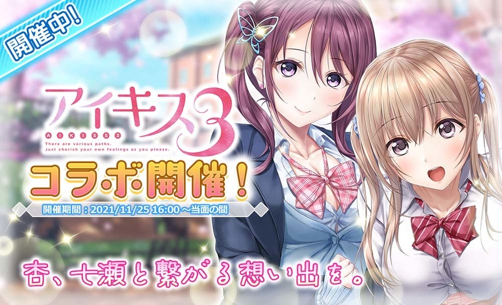 『アイキス3』とのクロスオーバーによる本作初のコラボイベント開催中!葛城七瀬と桜田杏のふたりのヒロインを迎え、彼女たちとのやり取りが気軽に楽しめるチャットイベントをお届けしております!