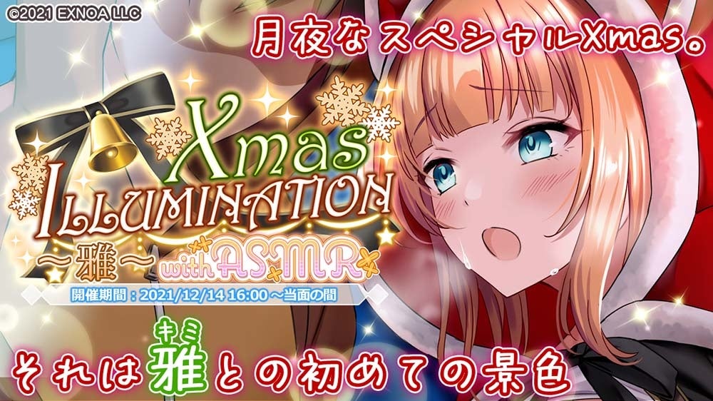 本日より、ヒロインたちと過ごすクリスマスの想い出を描くストーリーイベント第二弾「X’mas ILLUMINATION ~雅~ with ASMR」を開催いたします。今回のヒロインには琴雲雅(かなぐも みやび CV:海原エレナ)をフィーチャー、全編立体音響で収録したボイスが楽しめるプレミアムイベントとしてお届けいたします!!