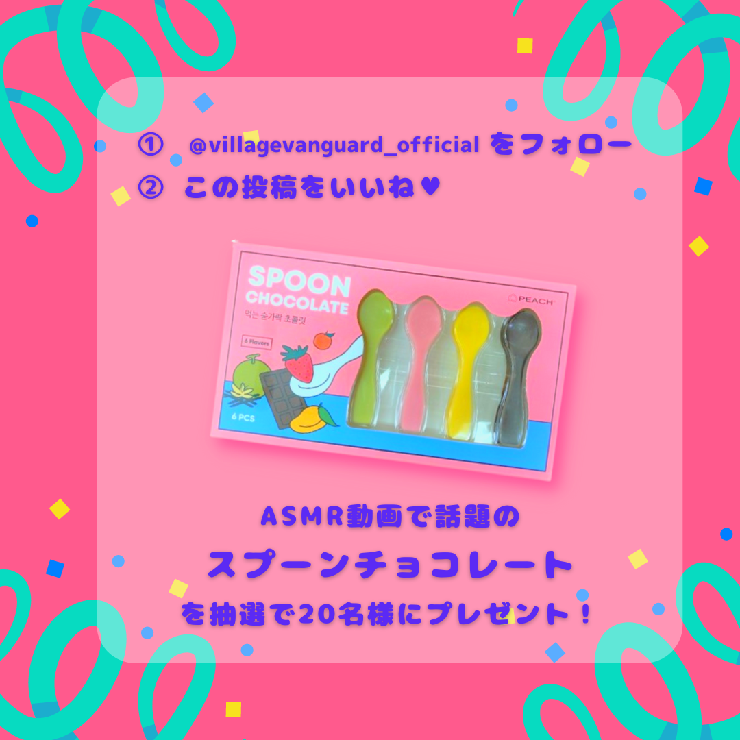 ヴィレッジヴァンガードの公式Instagramをフォローいただき、対象投稿をいいねをしていただくだけで、抽選で20名様にASMR動画でも話題の【スプーンチョコレート】が当たるキャンペーンを実施します。