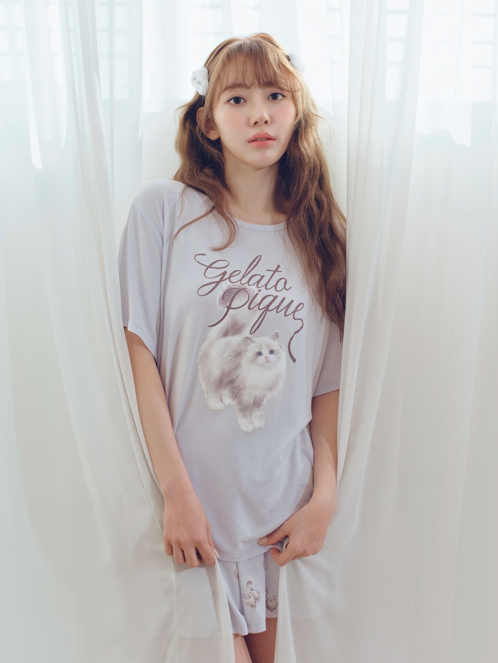 なめらかな肌触りが心地よいカットソーシリーズ。ふんわりと優しいタッチのアートは、カジュアルながらも上品な印象に。愛くるしいポーズの猫と、リボンで描いたようなロゴがポイントです。ワンピースは、カップ付きなので1枚でさらりと快適に過ごせます。