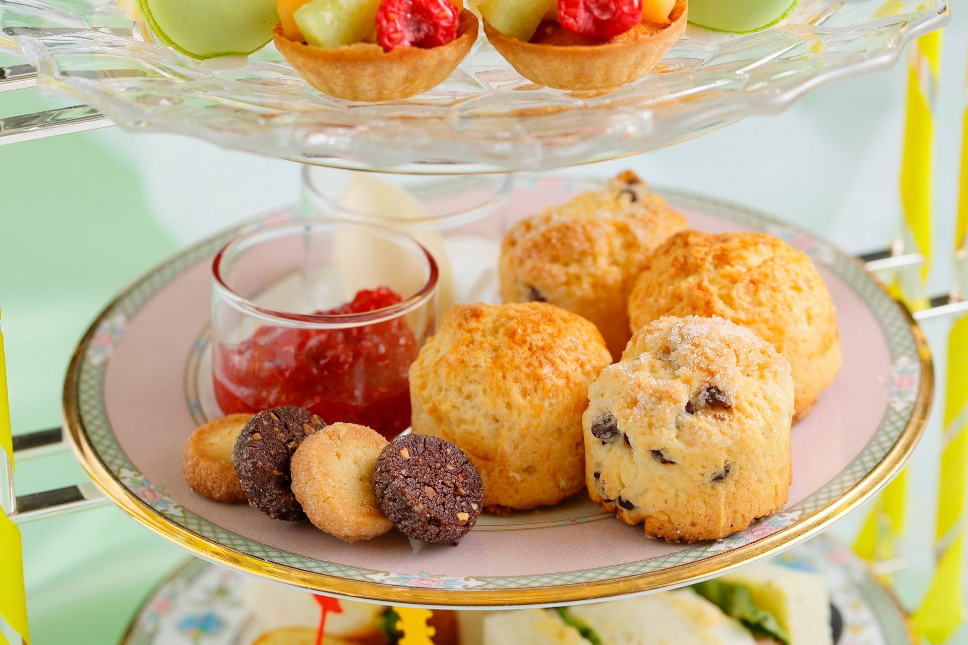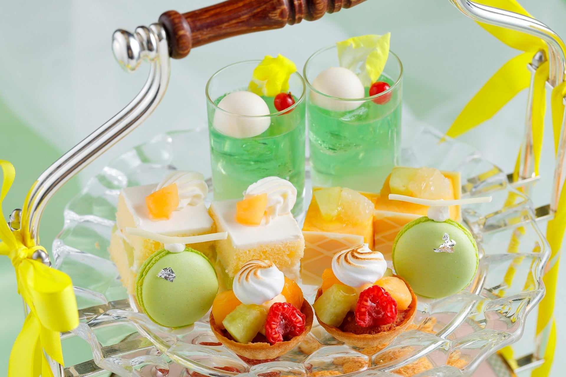 上段には翠と山吹の色合い鮮やかなメロンのスイーツプレートが登場。中段は王道のベイクドスイーツとディアマンクッキー、そして下段には軽食にピッタリなサンドイッチとオードブルを盛り付けた華やかなアフタヌーンティーセットです。ベイクドスイーツのスコーンはメロンパン風に焼き上げるなど、パティシエのこだわりを各所に詰め込みました。